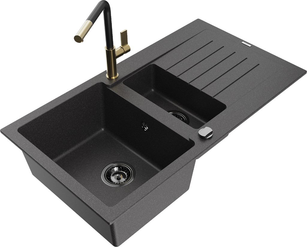 Technické dáta: drez: Rozmer: 900x505x200mm Hĺbka komory: 180 mm (väčšia), 115 mm (menšia) Rozmery komory: 435x335 mm (väčšie), 345x150 mm (menšie) Priemer odtoku: ø90 mm Typ: 1,5-miska s krátkym odkvapkávačom Typ: Zapustené do pracovnej dosky Farba: Škvrnitá čierna Povrchová úprava sifónu: čierna Materiál: žula (80% žulové kamenivo, 20% živice) Prepadový otvor: Áno Otvory: (batérie, automatické) 2 Inštalácia: Univerzálna, je možné inštalovať s odkvapkávačom na ľavú alebo pravú stranu Vysoká odolnosť proti poškriabaniu a zmene farby Odolnosť proti tepelným šokom Ľahko čistiteľný povrch Dva dodatočné vyfrézované otvory na samodierovanie ø35 kuchynská batéria: Materiál: mosadz Farba: Zlatá/Čierna Hlava: Keramická Prevzdušňovač: Áno Typ: Jedna páka Rozsah výtoku: 245 mm Výška batérie: 307 mm(GT) Ean: 5905315056856