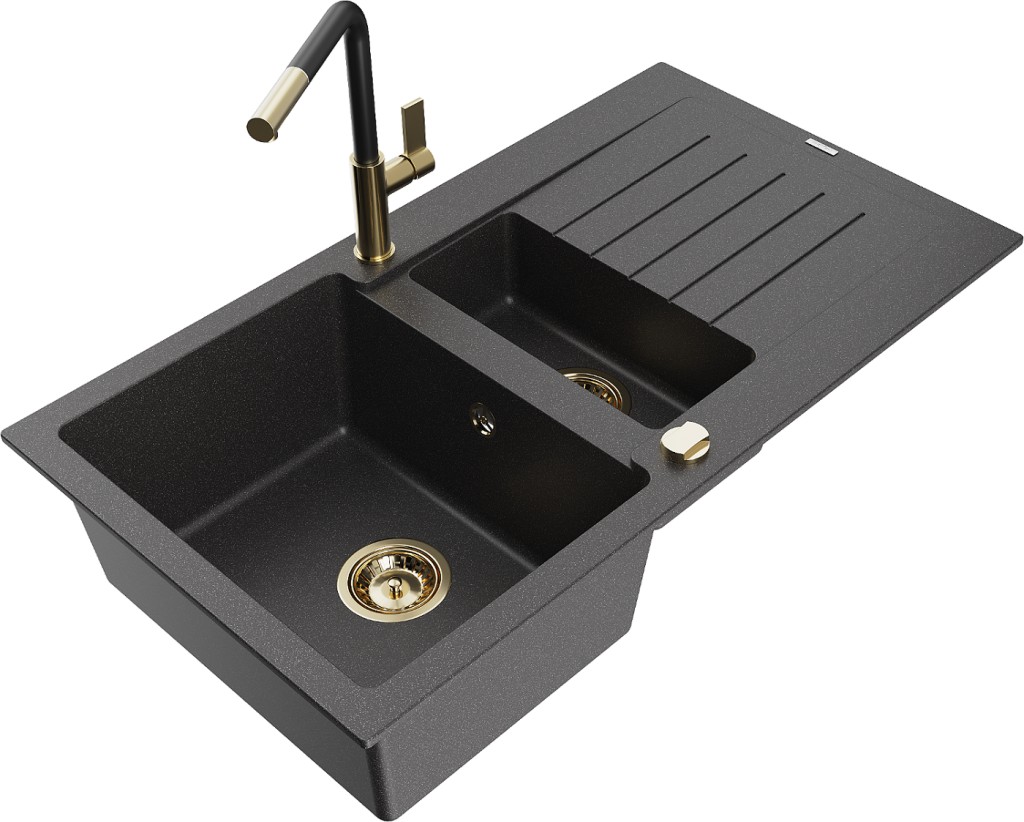 Technické dáta: drez: Rozmer: 900x505x200mm Hĺbka komory: 180 mm (väčšia), 115 mm (menšia) Rozmery komory: 435x335 mm (väčšie), 345x150 mm (menšie) Priemer odtoku: ø90 mm Typ: 1,5-miska s krátkym odkvapkávačom Typ: Zapustené do pracovnej dosky Farba: Škvrnitá čierna Povrchová úprava sifónu: zlatá Materiál: žula (80% žulové kamenivo, 20% živice) Prepadový otvor: Áno Otvory: (batérie, automatické) 2 Inštalácia: Univerzálna, je možné inštalovať s odkvapkávačom na ľavú alebo pravú stranu Vysoká odolnosť proti poškriabaniu a zmene farby Odolnosť proti tepelným šokom Ľahko čistiteľný povrch Dva dodatočné vyfrézované otvory na samodierovanie ø35 kuchynská batéria: Materiál: mosadz Farba: Zlatá/Čierna Hlava: Keramická Prevzdušňovač: Áno Typ: Jedna páka Rozsah výtoku: 245 mm Výška batérie: 307 mm(GT) Ean: 5905315056849