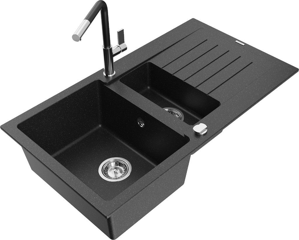 Technické dáta: drez: Rozmer: 900x505x200mm Hĺbka komory: 180 mm (väčšia), 115 mm (menšia) Rozmery komory: 435x335 mm (väčšie), 345x150 mm (menšie) Priemer odtoku: ø90 mm Typ: 1,5-komorový s krátkym odkvapkávačom Typ: Zapustené do pracovnej dosky Farba: čierna/strieborná metalíza Povrchová úprava sifónu: Chrome Materiál: žula (80% žulové kamenivo, 20% živice) Prepadový otvor: Áno Otvory: (batérie, automatické) 2 Inštalácia: Univerzálna, je možné inštalovať s odkvapkávačom na ľavú alebo pravú stranu Vysoká odolnosť proti poškriabaniu a zmene farby Odolnosť proti tepelným šokom Ľahko čistiteľný povrch Dva dodatočné vyfrézované otvory na samodierovanie ø35 kuchynská batéria: Materiál: mosadz Farba: chróm/čierna Hlava: Keramická Prevzdušňovač: Áno Typ: Jedna páka Rozsah výtoku: 245 mm Výška batérie: 307 mm(GT) Ean: 5905315056689