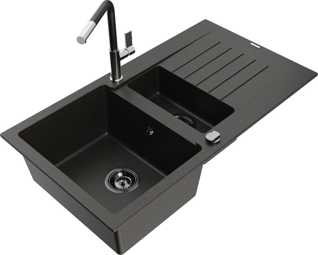 Technické dáta: drez: Rozmer: 900x505x200mm Hĺbka komory: 180 mm (väčšia), 115 mm (menšia) Rozmery komory: 435x335 mm (väčšie), 345x150 mm (menšie) Priemer odtoku: ø90 mm Typ: 1,5-komorový s krátkym odkvapkávačom Typ: Zapustené do pracovnej dosky Farba: čierna / zlatá metalíza Povrchová úprava sifónu: čierna Materiál: žula (80% žulové kamenivo, 20% živice) Prepadový otvor: Áno Otvory: (batérie, automatické) 2 Inštalácia: Univerzálna, je možné inštalovať s odkvapkávačom na ľavú alebo pravú stranu Vysoká odolnosť proti poškriabaniu a zmene farby Odolnosť proti tepelným šokom Ľahko čistiteľný povrch Dva dodatočné vyfrézované otvory na samodierovanie ø35 kuchynská batéria: Materiál: mosadz Farba: chróm/čierna Hlava: Keramická Prevzdušňovač: Áno Typ: Jedna páka Rozsah výtoku: 245 mm Výška batérie: 307 mm(GT) Ean: 5905315056757