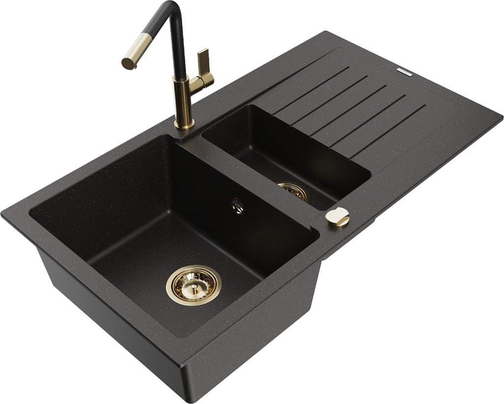Technické dáta: drez: Rozmer: 900x505x200mm Hĺbka komory: 180 mm (väčšia), 115 mm (menšia) Rozmery komory: 435x335 mm (väčšie), 345x150 mm (menšie) Priemer odtoku: ø90 mm Typ: 1,5-komorový s krátkym odkvapkávačom Typ: Zapustené do pracovnej dosky Farba: čierna / zlatá metalíza Povrchová úprava sifónu: zlatá Materiál: žula (80% žulové kamenivo, 20% živice) Prepadový otvor: Áno Otvory: (batérie, automatické) 2 Inštalácia: Univerzálna, je možné inštalovať s odkvapkávačom na ľavú alebo pravú stranu Vysoká odolnosť proti poškriabaniu a zmene farby Odolnosť proti tepelným šokom Ľahko čistiteľný povrch Dva dodatočné vyfrézované otvory na samodierovanie ø35 kuchynská batéria: Materiál: mosadz Farba: Zlatá/Čierna Hlava: Keramická Prevzdušňovač: Áno Typ: Jedna páka Rozsah výtoku: 245 mm Výška batérie: 307 mm(GT) Ean: 5905315056764