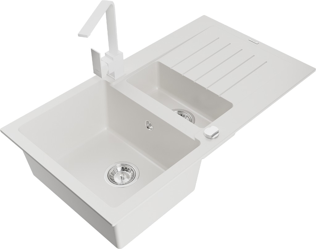 Technické dáta: drez: Rozmer: 900x505x200mm Hĺbka komory: 180 mm (väčšia), 115 mm (menšia) Rozmery komory: 435x335 mm (väčšie), 345x150 mm (menšie) Priemer odtoku: ø90 mm Typ: 1,5-komorový s krátkym odkvapkávačom Typ: Zapustené do pracovnej dosky biela farba Povrchová úprava sifónu: Chrome Materiál: žula (80% žulové kamenivo, 20% živice) Prepadový otvor: Áno Otvory: (batérie, automatické) 2 Inštalácia: Univerzálna, je možné inštalovať s odkvapkávačom na ľavú alebo pravú stranu Vysoká odolnosť proti poškriabaniu a zmene farby Odolnosť proti tepelným šokom Ľahko čistiteľný povrch Dva dodatočné vyfrézované otvory na samodierovanie ø35 kuchynská batéria: Materiál: mosadz biela farba Hlava: Keramická Prevzdušňovač: Áno Typ: Jedna páka Výška batérie: 290 mm Rozsah výtoku: 220 mm(GT) Ean: 5905315017222