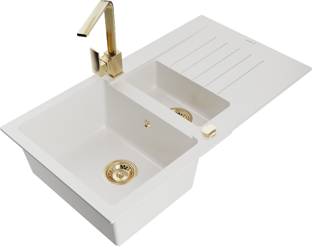 Technické dáta: drez: Rozmer: 900x505x200mm Hĺbka komory: 180 mm (väčšia), 115 mm (menšia) Rozmery komory: 435x335 mm (väčšie), 345x150 mm (menšie) Priemer odtoku: ø90 mm Typ: 1,5-komorový s krátkym odkvapkávačom Typ: Zapustené do pracovnej dosky biela farba Povrchová úprava sifónu: zlatá Materiál: žula (80% žulové kamenivo, 20% živice) Prepadový otvor: Áno Otvory: (batérie, automatické) 2 Inštalácia: Univerzálna, je možné inštalovať s odkvapkávačom na ľavú alebo pravú stranu Vysoká odolnosť proti poškriabaniu a zmene farby Odolnosť proti tepelným šokom Ľahko čistiteľný povrch Dva dodatočné vyfrézované otvory na samodierovanie ø35 kuchynská batéria: Materiál: mosadz Farba: Zlatá Hlava: Keramická Prevzdušňovač: Áno Typ: Jedna páka Výška batérie: 290 mm Rozsah výtoku: 220 mm(GT) Ean: 5905315017239