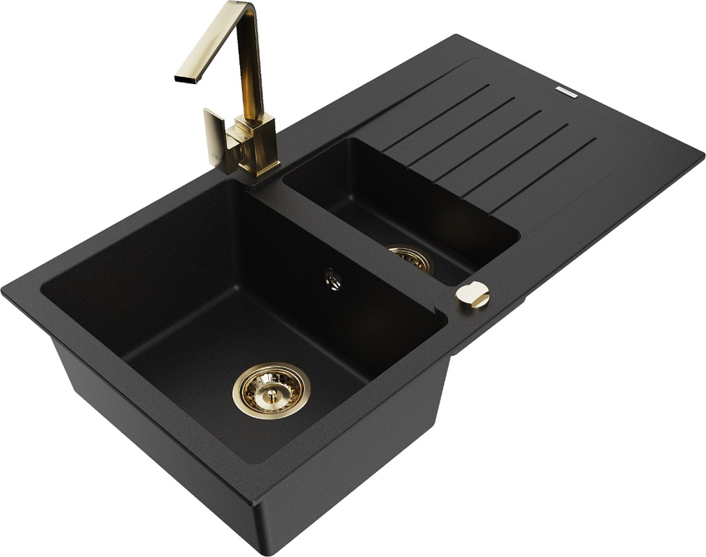 Technické dáta: drez: Rozmer: 900x505x200mm Hĺbka komory: 180 mm (väčšia), 115 mm (menšia) Rozmery komory: 435x335 mm (väčšie), 345x150 mm (menšie) Priemer odtoku: ø90 mm Typ: 1,5-komorový s krátkym odkvapkávačom Typ: Zapustené do pracovnej dosky Čierna farba Povrchová úprava sifónu: zlatá Materiál: žula (80% žulové kamenivo, 20% živice) Prepadový otvor: Áno Otvory: (batérie, automatické) 2 Inštalácia: Univerzálna, je možné inštalovať s odkvapkávačom na ľavú alebo pravú stranu Vysoká odolnosť proti poškriabaniu a zmene farby Odolnosť proti tepelným šokom Ľahko čistiteľný povrch Dva dodatočné vyfrézované otvory na samodierovanie ø35 kuchynská batéria: Materiál: mosadz Farba: Zlatá Hlava: Keramická Prevzdušňovač: Áno Typ: Jedna páka Výška batérie: 290 mm Rozsah výtoku: 220 mm(GT) Ean: 5905315017499