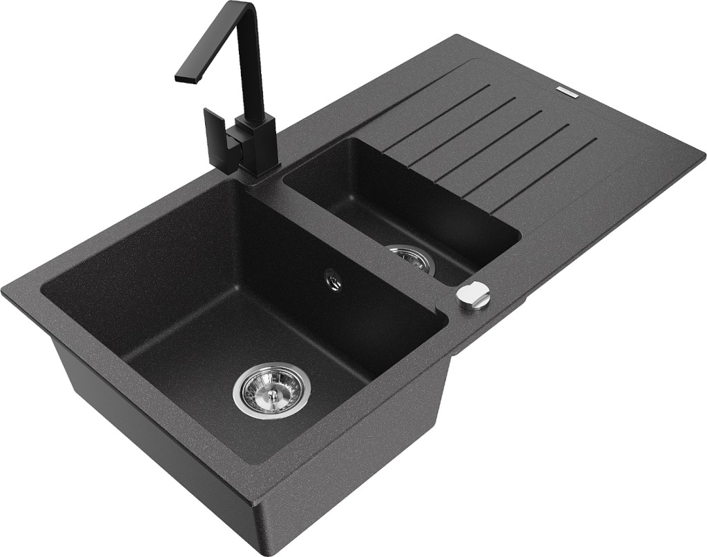 Technické dáta: drez: Rozmer: 900x505x200mm Hĺbka komory: 180 mm (väčšia), 115 mm (menšia) Rozmery komory: 435x335 mm (väčšie), 345x150 mm (menšie) Priemer odtoku: ø90 mm Typ: 1,5-komorový s krátkym odkvapkávačom Typ: Zapustené do pracovnej dosky Farba: Škvrnitá čierna Povrchová úprava sifónu: Chrome Materiál: žula (80% žulové kamenivo, 20% živice) Prepadový otvor: Áno Otvory: (batérie, automatické) 2 Inštalácia: Univerzálna, je možné inštalovať s odkvapkávačom na ľavú alebo pravú stranu Vysoká odolnosť proti poškriabaniu a zmene farby Odolnosť proti tepelným šokom Ľahko čistiteľný povrch Dva dodatočné vyfrézované otvory na samodierovanie ø35 kuchynská batéria: Materiál: mosadz Čierna farba Hlava: Keramická Prevzdušňovač: Áno Typ: Jedna páka Výška batérie: 290 mm Rozsah výtoku: 220 mm(GT) Ean: 5905315017451