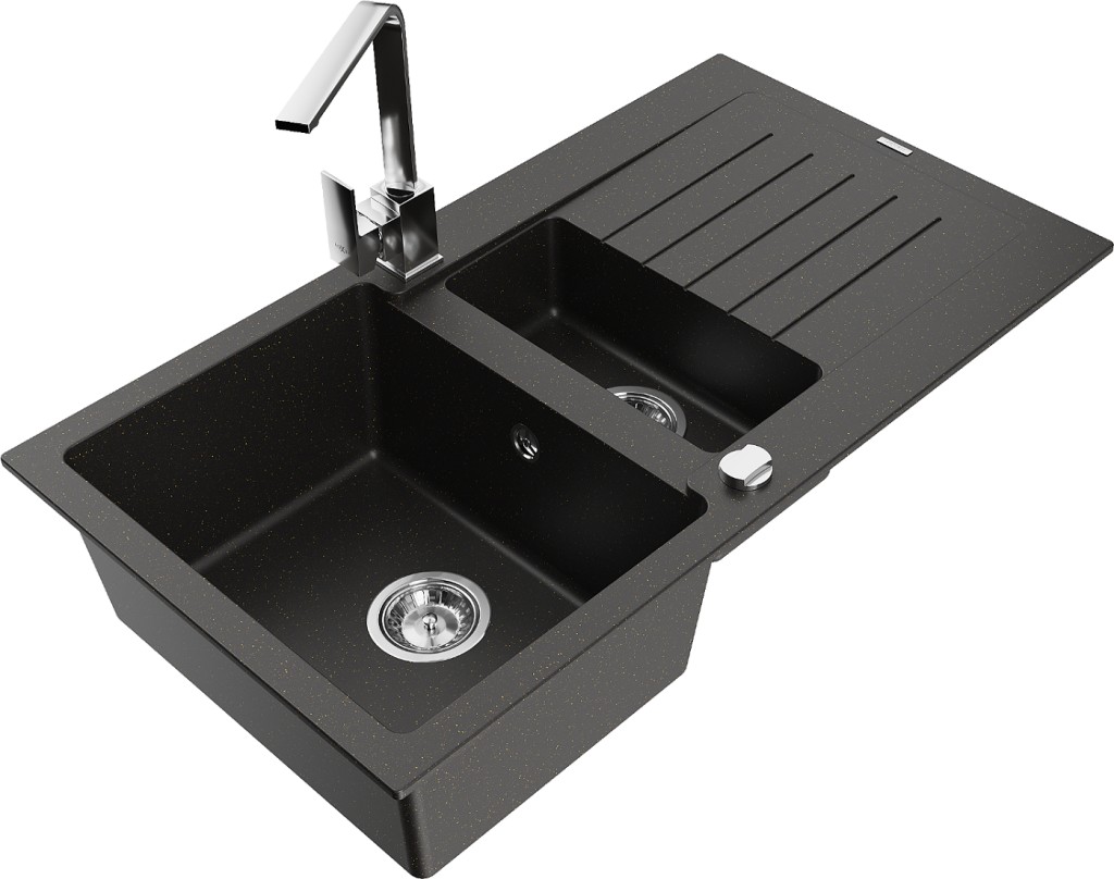 Technické dáta: drez: Rozmer: 900x505x200mm Hĺbka komory: 180 mm (väčšia), 115 mm (menšia) Rozmery komory: 435x335 mm (väčšie), 345x150 mm (menšie) Priemer odtoku: ø90 mm Typ: 1,5-komorový s krátkym odkvapkávačom Typ: Zapustené do pracovnej dosky Farba: čierna / zlatá metalíza Povrchová úprava sifónu: Chrome Materiál: žula (80% žulové kamenivo, 20% živice) Prepadový otvor: Áno Otvory: (batérie, automatické) 2 Inštalácia: Univerzálna, je možné inštalovať s odkvapkávačom na ľavú alebo pravú stranu Vysoká odolnosť proti poškriabaniu a zmene farby Odolnosť proti tepelným šokom Ľahko čistiteľný povrch Dva dodatočné vyfrézované otvory na samodierovanie ø35 kuchynská batéria: Materiál: mosadz Farba: Chrome Hlava: Keramická Prevzdušňovač: Áno Typ: Jedna páka Výška batérie: 290 mm Rozsah výtoku: 220 mm(GT) Ean: 5905315017390