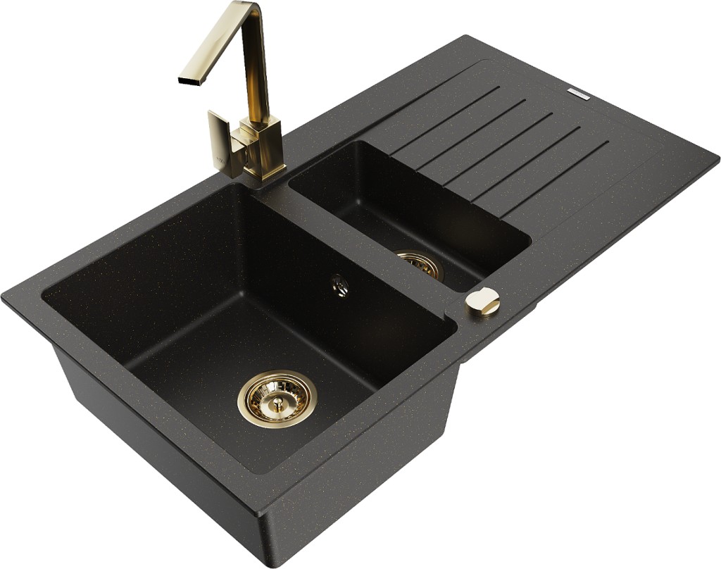 Technické dáta: drez: Rozmer: 900x505x200mm Hĺbka komory: 180 mm (väčšia), 115 mm (menšia) Rozmery komory: 435x335 mm (väčšie), 345x150 mm (menšie) Priemer odtoku: ø90 mm Typ: 1,5-komorový s krátkym odkvapkávačom Typ: Zapustené do pracovnej dosky Farba: čierna / zlatá metalíza Povrchová úprava sifónu: zlatá Materiál: žula (80% žulové kamenivo, 20% živice) Prepadový otvor: Áno Otvory: (batérie, automatické) 2 Inštalácia: Univerzálna, je možné inštalovať s odkvapkávačom na ľavú alebo pravú stranu Vysoká odolnosť proti poškriabaniu a zmene farby Odolnosť proti tepelným šokom Ľahko čistiteľný povrch Dva dodatočné vyfrézované otvory na samodierovanie ø35 kuchynská batéria: Materiál: mosadz Farba: Zlatá Hlava: Keramická Prevzdušňovač: Áno Typ: Jedna páka Výška batérie: 290 mm Rozsah výtoku: 220 mm(GT) Ean: 5905315017383