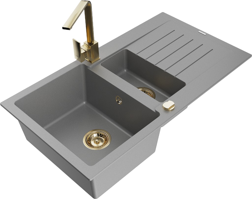 Technické dáta: drez: Rozmer: 900x505x200mm Hĺbka komory: 180 mm (väčšia), 115 mm (menšia) Rozmery komory: 435x335 mm (väčšie), 345x150 mm (menšie) Priemer odtoku: ø90 mm Typ: 1,5-komorový s krátkym odkvapkávačom Typ: Zapustené do pracovnej dosky Šedá farba Povrchová úprava sifónu: zlatá Materiál: žula (80% žulové kamenivo, 20% živice) Prepadový otvor: Áno Otvory: (batérie, automatické) 2 Inštalácia: Univerzálna, je možné inštalovať s odkvapkávačom na ľavú alebo pravú stranu Vysoká odolnosť proti poškriabaniu a zmene farby Odolnosť proti tepelným šokom Ľahko čistiteľný povrch Dva dodatočné vyfrézované otvory na samodierovanie ø35 kuchynská batéria: Materiál: mosadz Farba: Zlatá Hlava: Keramická Prevzdušňovač: Áno Typ: Jedna páka Výška batérie: 290 mm Rozsah výtoku: 220 mm(GT) Ean: 5905315017307