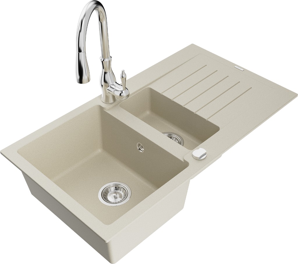 Technické dáta: drez: Rozmer: 900x505x200mm Hĺbka komory: 180 mm (väčšia), 115 mm (menšia) Rozmery komory: 435x335 mm (väčšie), 345x150 mm (menšie) Priemer odtoku: ø90 mm Typ: 1,5-komorový s krátkym odkvapkávačom Typ: Zapustené do pracovnej dosky Farba béžová Povrchová úprava sifónu: Chrome Materiál: žula (80% žulové kamenivo, 20% živice) Prepadový otvor: Áno Otvory: (batérie, automatické) 2 Inštalácia: Univerzálna, je možné inštalovať s odkvapkávačom na ľavú alebo pravú stranu Vysoká odolnosť proti poškriabaniu a zmene farby Odolnosť proti tepelným šokom Ľahko čistiteľný povrch Dva dodatočné vyfrézované otvory na samodierovanie ø35 kuchynská batéria: Materiál: mosadz Farba: Chrome Hlava: Keramická Prevzdušňovač: Áno Výška batérie: 410 mm Rozsah výtoku: 231 mm(GT) Ean: 5905315032621