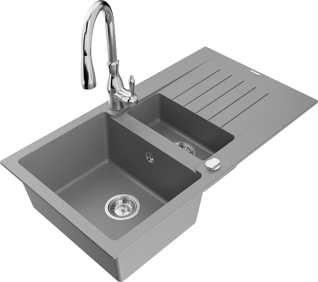 Technické dáta: drez: Rozmer: 900x505x200mm Hĺbka komory: 180 mm (väčšia), 115 mm (menšia) Rozmery komory: 435x335 mm (väčšie), 345x150 mm (menšie) Priemer odtoku: ø90 mm Typ: 1,5-komorový s krátkym odkvapkávačom Typ: Zapustené do pracovnej dosky Šedá farba Povrchová úprava sifónu: Chrome Materiál: žula (80% žulové kamenivo, 20% živice) Prepadový otvor: Áno Otvory: (batérie, automatické) 2 Inštalácia: Univerzálna, je možné inštalovať s odkvapkávačom na ľavú alebo pravú stranu Vysoká odolnosť proti poškriabaniu a zmene farby Odolnosť proti tepelným šokom Ľahko čistiteľný povrch Dva dodatočné vyfrézované otvory na samodierovanie ø35 kuchynská batéria: Materiál: mosadz Farba: Chrome Hlava: Keramická Prevzdušňovač: Áno Výška batérie: 410 mm Rozsah výtoku: 231 mm(GT) Ean: 5905315032669