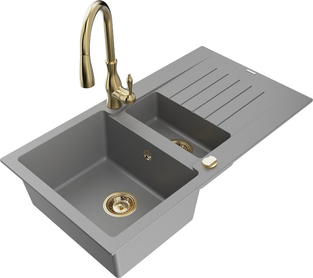 Technické dáta: drez: Rozmer: 900x505x200mm Hĺbka komory: 180 mm (väčšia), 115 mm (menšia) Rozmery komory: 435x335 mm (väčšie), 345x150 mm (menšie) Priemer odtoku: ø90 mm Typ: 1,5-komorový s krátkym odkvapkávačom Typ: Zapustené do pracovnej dosky Šedá farba Povrchová úprava sifónu: zlatá Materiál: žula (80% žulové kamenivo, 20% živice) Prepadový otvor: Áno Otvory: (batérie, automatické) 2 Inštalácia: Univerzálna, je možné inštalovať s odkvapkávačom na ľavú alebo pravú stranu Vysoká odolnosť proti poškriabaniu a zmene farby Odolnosť proti tepelným šokom Ľahko čistiteľný povrch Dva dodatočné vyfrézované otvory na samodierovanie ø35 kuchynská batéria: Materiál: mosadz Farba: Zlatá Hlava: Keramická Prevzdušňovač: Áno Výška batérie: 410 mm Rozsah výtoku: 231 mm(GT) Ean: 5905315032676