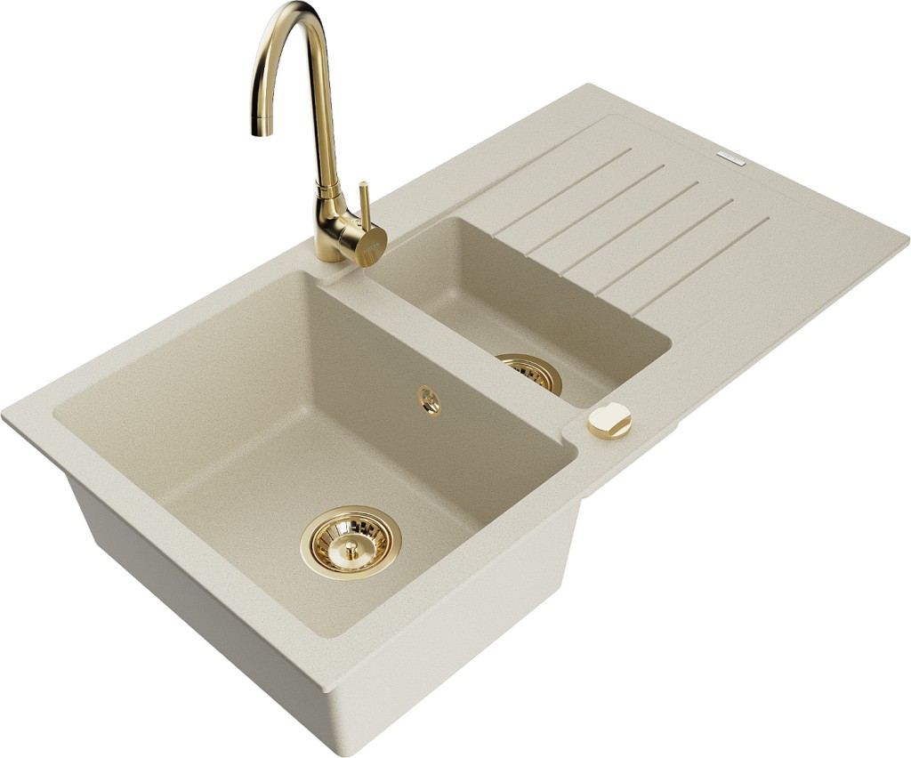 Technické dáta: drez: Rozmer: 900x505x200mm Hĺbka komory: 180 mm (väčšia), 115 mm (menšia) Rozmery komory: 435x335 mm (väčšie), 345x150 mm (menšie) Priemer odtoku: ø90 mm Typ: 1,5-komorový s krátkym odkvapkávačom Typ: Zapustené do pracovnej dosky Farba béžová Povrchová úprava sifónu: zlatá Materiál: žula (80% žulové kamenivo, 20% živice) Prepadový otvor: Áno Otvory: (batérie, automatické) 2 Inštalácia: Univerzálna, je možné inštalovať s odkvapkávačom na ľavú alebo pravú stranu Vysoká odolnosť proti poškriabaniu a zmene farby Odolnosť proti tepelným šokom Ľahko čistiteľný povrch Dva dodatočné vyfrézované otvory na samodierovanie ø35 kuchynská batéria: Materiál: mosadz Farba: Zlatá Hlava: Keramická Prevzdušňovač: Áno Typ: Jedna páka Výška batérie: 335 mm Rozsah výtoku: 180 mm(GT) Ean: 5905315013910