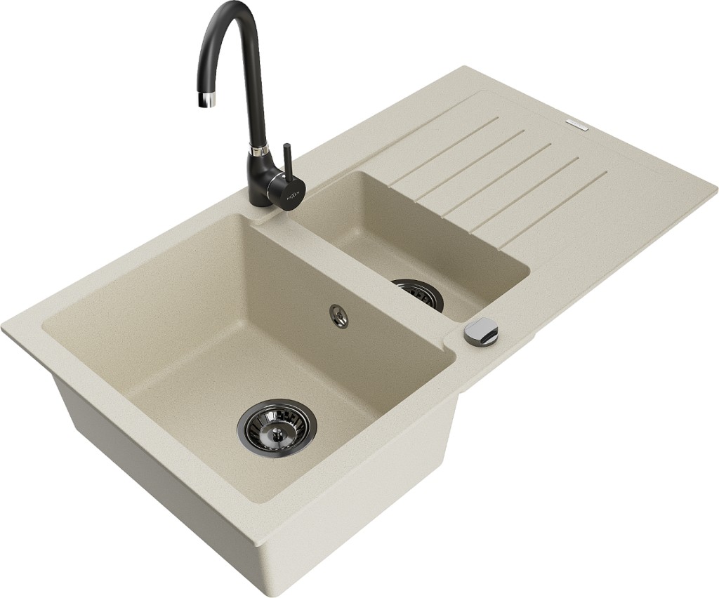 Technické dáta: drez: Rozmer: 900x505x200mm Hĺbka komory: 180 mm (väčšia), 115 mm (menšia) Rozmery komory: 435x335 mm (väčšie), 345x150 mm (menšie) Priemer odtoku: ø90 mm Typ: 1,5-komorový s krátkym odkvapkávačom Typ: Zapustené do pracovnej dosky Farba béžová Povrchová úprava sifónu: čierna Materiál: žula (80% žulové kamenivo, 20% živice) Prepadový otvor: Áno Otvory: (batérie, automatické) 2 Inštalácia: Univerzálna, je možné inštalovať s odkvapkávačom na ľavú alebo pravú stranu Vysoká odolnosť proti poškriabaniu a zmene farby Odolnosť proti tepelným šokom Ľahko čistiteľný povrch Dva dodatočné vyfrézované otvory na samodierovanie ø35 kuchynská batéria: Materiál: mosadz Čierna farba Hlava: Keramická Prevzdušňovač: Áno Typ: Jedna páka Výška batérie: 335 mm Rozsah výtoku: 180 mm (GT) Ean: 5905315013927