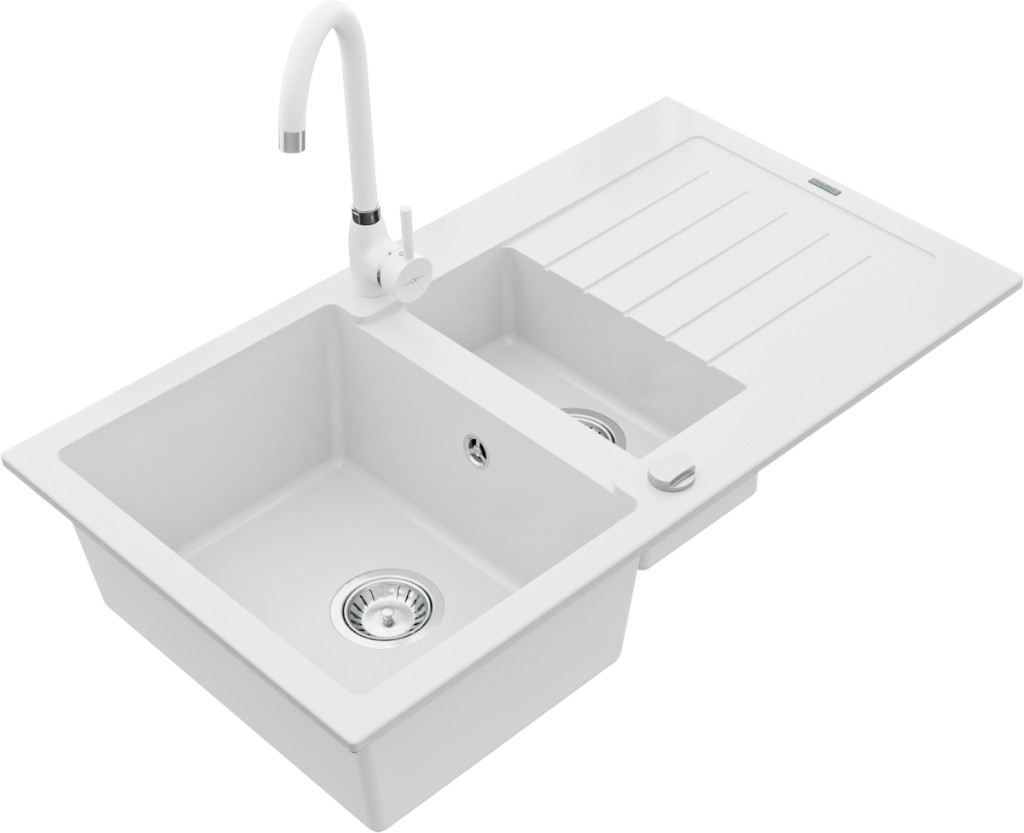 Technické dáta: drez: Rozmer: 900x505x200mm Hĺbka komory: 180 mm (väčšia), 115 mm (menšia) Rozmery komory: 435x335 mm (väčšie), 345x150 mm (menšie) Priemer odtoku: ø90 mm Typ: 1,5-komorový s krátkym odkvapkávačom Typ: Zapustené do pracovnej dosky biela farba Povrchová úprava sifónu: Chrome Materiál: žula (80% žulové kamenivo, 20% živice) Prepadový otvor: Áno Otvory: (batérie, automatické) 2 Inštalácia: Univerzálna, je možné inštalovať s odkvapkávačom na ľavú alebo pravú stranu Vysoká odolnosť proti poškriabaniu a zmene farby Odolnosť proti tepelným šokom Ľahko čistiteľný povrch Dva dodatočné vyfrézované otvory na samodierovanie ø35 kuchynská batéria: Materiál: mosadz biela farba Hlava: Keramická Prevzdušňovač: Áno Výška batérie: 335 mm Rozsah výtoku: 180 mm(GT) Ean: 5907709189119