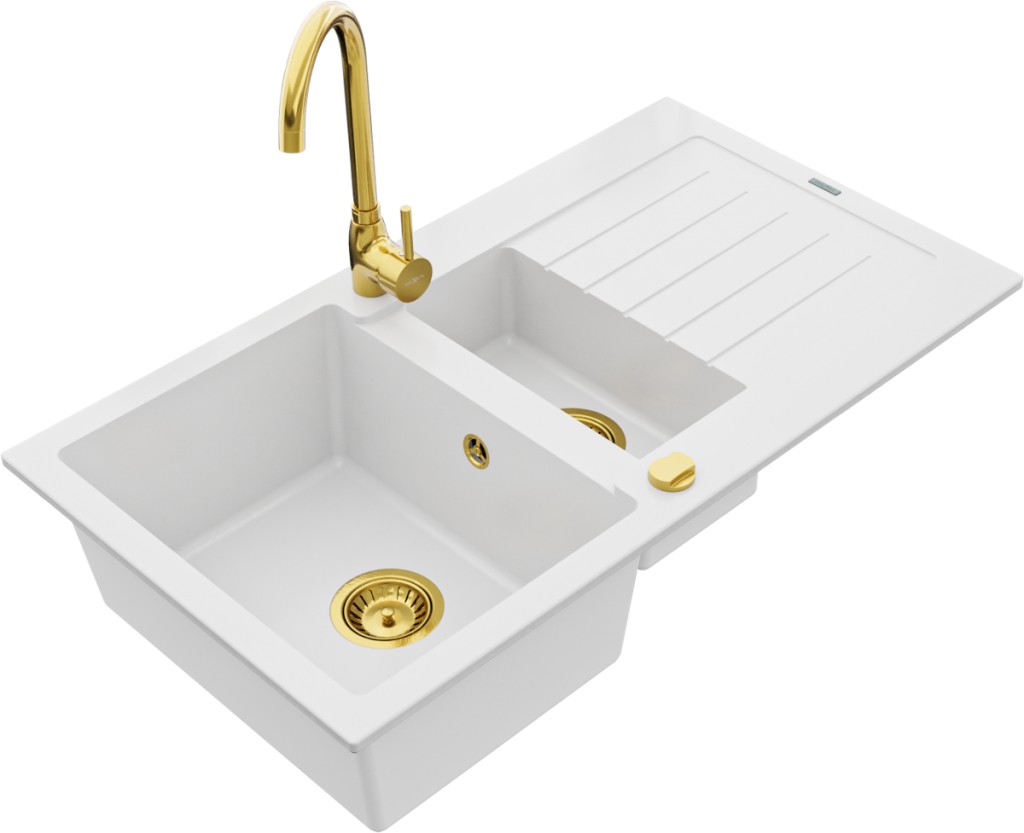Technické dáta: drez: Rozmer: 900x505x200mm Hĺbka komory: 180 mm (väčšia), 115 mm (menšia) Rozmery komory: 435x335 mm (väčšie), 345x150 mm (menšie) Priemer odtoku: ø90 mm Typ: 1,5-komorový s krátkym odkvapkávačom Typ: Zapustené do pracovnej dosky biela farba Povrchová úprava sifónu: zlatá Materiál: žula (80% žulové kamenivo, 20% živice) Prepadový otvor: Áno Otvory: (batérie, automatické) 2 Inštalácia: Univerzálna, je možné inštalovať s odkvapkávačom na ľavú alebo pravú stranu Vysoká odolnosť proti poškriabaniu a zmene farby Odolnosť proti tepelným šokom Ľahko čistiteľný povrch Dva dodatočné vyfrézované otvory na samodierovanie ø35 kuchynská batéria: Materiál: mosadz Farba: Zlatá Hlava: Keramická Prevzdušňovač: Áno Výška batérie: 335 mm Rozsah výtoku: 180 mm(GT) Ean: 5907709189126