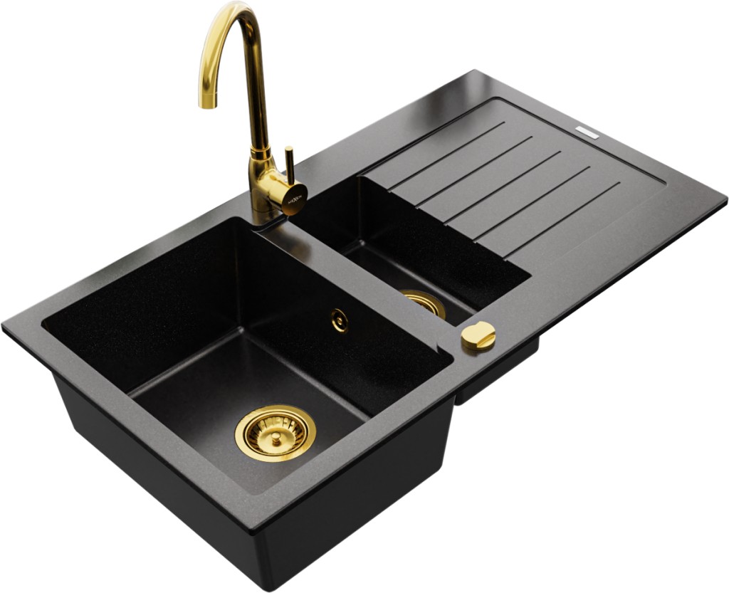 Technické dáta: drez: Rozmer: 900x505x200mm Hĺbka komory: 180 mm (väčšia), 115 mm (menšia) Rozmery komory: 435x335 mm (väčšie), 345x150 mm (menšie) Priemer odtoku: ø90 mm Typ: 1,5-komorový s krátkym odkvapkávačom Typ: Zapustené do pracovnej dosky Čierna farba Povrchová úprava sifónu: zlatá Materiál: žula (80% žulové kamenivo, 20% živice) Prepadový otvor: Áno Otvory: (batérie, automatické) 2 Inštalácia: Univerzálna, je možné inštalovať s odkvapkávačom na ľavú alebo pravú stranu Vysoká odolnosť proti poškriabaniu a zmene farby Odolnosť proti tepelným šokom Ľahko čistiteľný povrch Dva dodatočné vyfrézované otvory na samodierovanie ø35 kuchynská batéria: Materiál: mosadz Farba: Zlatá Hlava: Keramická Prevzdušňovač: Áno Výška batérie: 335 mm Rozsah výtoku: 180 mm(GT) Ean: 5907709189232