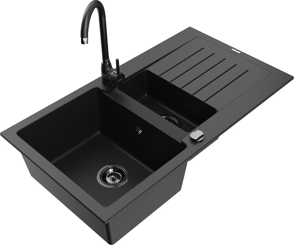 Technické dáta: drez: Rozmer: 900x505x200mm Hĺbka komory: 180 mm (väčšia), 115 mm (menšia) Rozmery komory: 435x335 mm (väčšie), 345x150 mm (menšie) Priemer odtoku: ø90 mm Typ: 1,5-komorový s krátkym odkvapkávačom Typ: Zapustené do pracovnej dosky Čierna farba Povrchová úprava sifónu: čierna Materiál: žula (80% žulové kamenivo, 20% živice) Prepadový otvor: Áno Otvory: (batérie, automatické) 2 Inštalácia: Univerzálna, je možné inštalovať s odkvapkávačom na ľavú alebo pravú stranu Vysoká odolnosť proti poškriabaniu a zmene farby Odolnosť proti tepelným šokom Ľahko čistiteľný povrch Dva dodatočné vyfrézované otvory na samodierovanie ø35 kuchynská batéria: Materiál: mosadz Čierna farba Hlava: Keramická Prevzdušňovač: Áno Typ: Jedna páka Výška batérie: 335 mm Rozsah výtoku: 180 mm(GT) Ean: 5905315014054