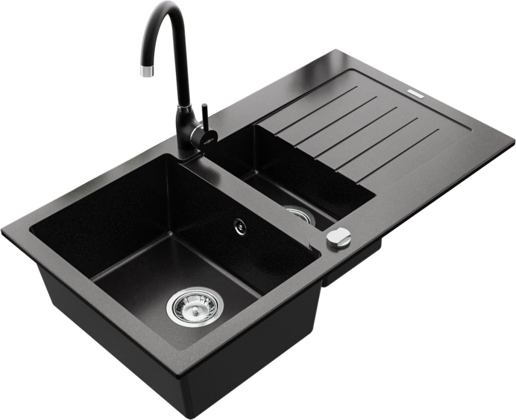 Technické dáta: drez: Rozmer: 900x505x200mm Hĺbka komory: 180 mm (väčšia), 115 mm (menšia) Rozmery komory: 435x335 mm (väčšie), 345x150 mm (menšie) Priemer odtoku: ø90 mm Typ: 1,5-komorový s krátkym odkvapkávačom Typ: Zapustené do pracovnej dosky Čierna farba Povrchová úprava sifónu: Chrome Materiál: žula (80% žulové kamenivo, 20% živice) Prepadový otvor: Áno Otvory: (batérie, automatické) 2 Inštalácia: Univerzálna, je možné inštalovať s odkvapkávačom na ľavú alebo pravú stranu Vysoká odolnosť proti poškriabaniu a zmene farby Odolnosť proti tepelným šokom Ľahko čistiteľný povrch Dva dodatočné vyfrézované otvory na samodierovanie ø35 kuchynská batéria: Materiál: mosadz Čierna farba Hlava: Keramická Prevzdušňovač: Áno Výška batérie: 335 mm Rozsah výtoku: 180 mm(GT) Ean: 5907709189249
