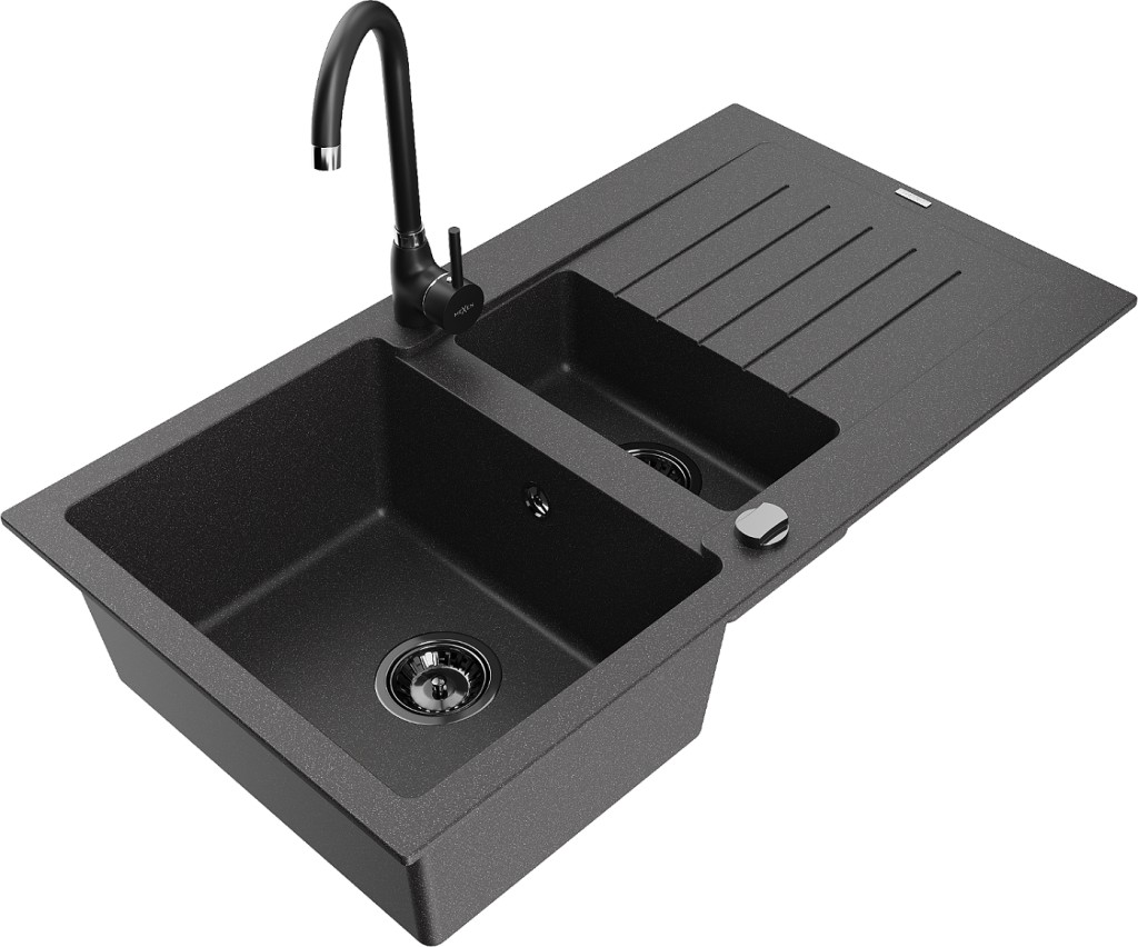 Technické dáta: drez: Rozmer: 900x505x200mm Hĺbka komory: 180 mm (väčšia), 115 mm (menšia) Rozmery komory: 435x335 mm (väčšie), 345x150 mm (menšie) Priemer odtoku: ø90 mm Typ: 1,5-komorový s krátkym odkvapkávačom Typ: Zapustené do pracovnej dosky Farba: Škvrnitá čierna Povrchová úprava sifónu: čierna Materiál: žula (80% žulové kamenivo, 20% živice) Prepadový otvor: Áno Otvory: (batérie, automatické) 2 Inštalácia: Univerzálna, je možné inštalovať s odkvapkávačom na ľavú alebo pravú stranu Vysoká odolnosť proti poškriabaniu a zmene farby Odolnosť proti tepelným šokom Ľahko čistiteľný povrch Dva dodatočné vyfrézované otvory na samodierovanie ø35 kuchynská batéria: Materiál: mosadz Čierna farba Hlava: Keramická Prevzdušňovač: Áno Typ: Jedna páka Výška batérie: 335 mm Rozsah výtoku: 180 mm(GT) Ean: 5905315014030