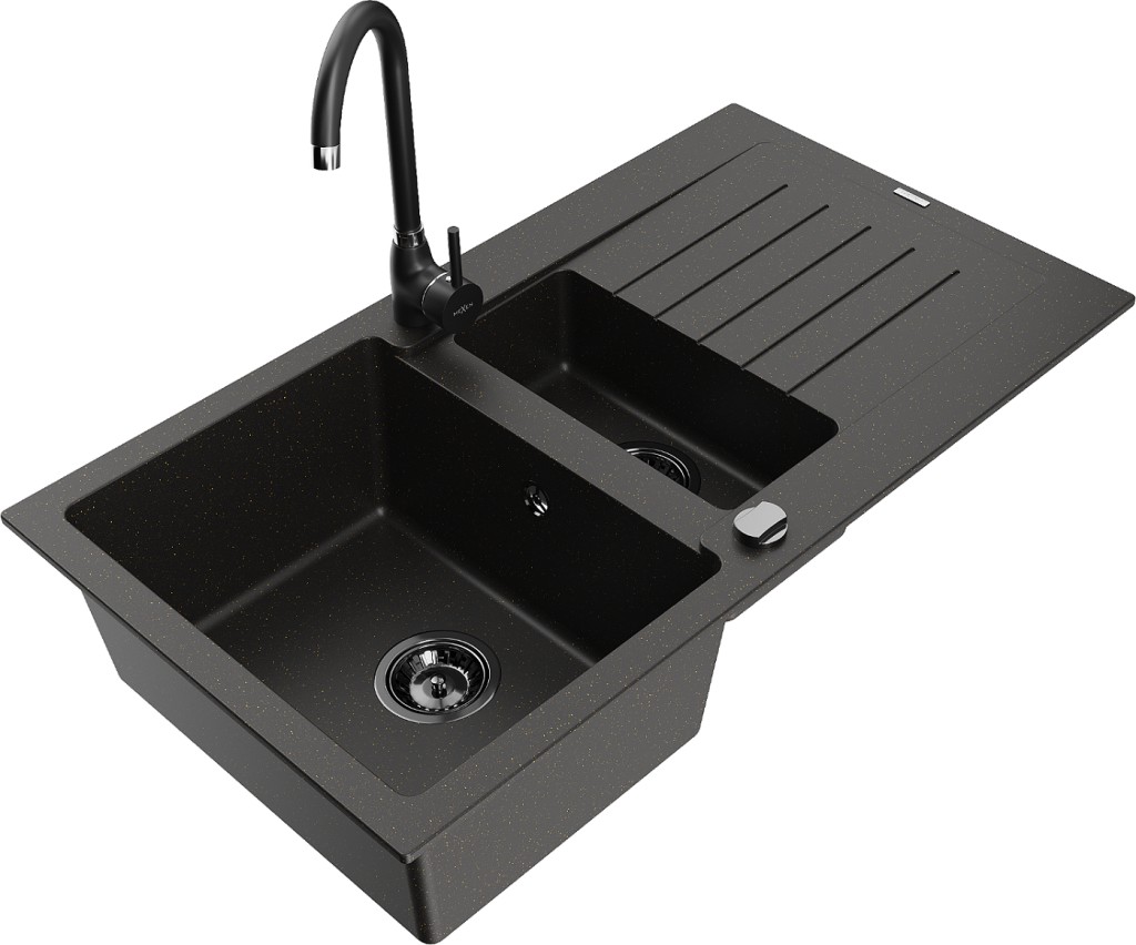 Technické dáta: drez: Rozmer: 900x505x200mm Hĺbka komory: 180 mm (väčšia), 115 mm (menšia) Rozmery komory: 435x335 mm (väčšie), 345x150 mm (menšie) Priemer odtoku: ø90 mm Typ: 1,5-komorový s krátkym odkvapkávačom Typ: Zapustené do pracovnej dosky Farba: čierna / zlatá metalíza Povrchová úprava sifónu: čierna Materiál: žula (80% žulové kamenivo, 20% živice) Prepadový otvor: Áno Otvory: (batérie, automatické) 2 Inštalácia: Univerzálna, je možné inštalovať s odkvapkávačom na ľavú alebo pravú stranu Vysoká odolnosť proti poškriabaniu a zmene farby Odolnosť proti tepelným šokom Ľahko čistiteľný povrch Dva dodatočné vyfrézované otvory na samodierovanie ø35 kuchynská batéria: Materiál: mosadz Čierna farba Hlava: Keramická Prevzdušňovač: Áno Typ: Jedna páka Výška batérie: 335 mm Rozsah výtoku: 180 mm(GT) Ean: 5905315014009