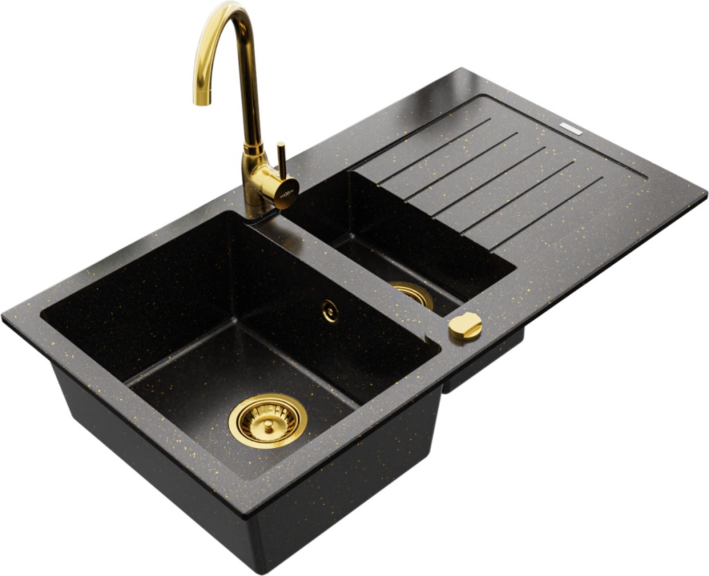 Technické dáta: drez: Rozmer: 900x505x200mm Hĺbka komory: 180 mm (väčšia), 115 mm (menšia) Rozmery komory: 435x335 mm (väčšie), 345x150 mm (menšie) Priemer odtoku: ø90 mm Typ: 1,5-komorový s krátkym odkvapkávačom Typ: Zapustené do pracovnej dosky Farba: čierna / zlatá metalíza Povrchová úprava sifónu: Chrome Materiál: žula (80% žulové kamenivo, 20% živice) Prepadový otvor: Áno Otvory: (batérie, automatické) 2 Inštalácia: Univerzálna, je možné inštalovať s odkvapkávačom na ľavú alebo pravú stranu Vysoká odolnosť proti poškriabaniu a zmene farby Odolnosť proti tepelným šokom Ľahko čistiteľný povrch Dva dodatočné vyfrézované otvory na samodierovanie ø35 kuchynská batéria: Materiál: mosadz Farba: Zlatá Hlava: Keramická Prevzdušňovač: Áno Výška batérie: 335 mm Rozsah výtoku: 180 mm(GT) Ean: 5907709189188