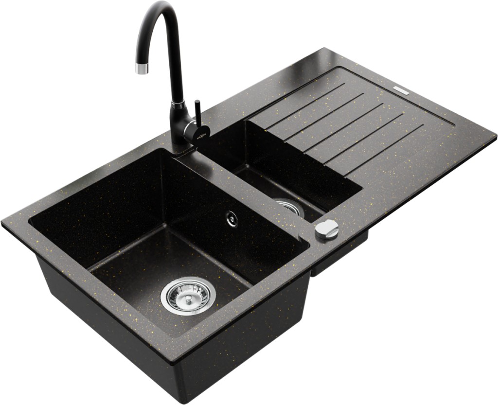Technické dáta: drez: Rozmer: 900x505x200mm Hĺbka komory: 180 mm (väčšia), 115 mm (menšia) Rozmery komory: 435x335 mm (väčšie), 345x150 mm (menšie) Priemer odtoku: ø90 mm Typ: 1,5-komorový s krátkym odkvapkávačom Typ: Zapustené do pracovnej dosky Farba: čierna / zlatá metalíza Povrchová úprava sifónu: Chrome Materiál: žula (80% žulové kamenivo, 20% živice) Prepadový otvor: Áno Otvory: (batérie, automatické) 2 Inštalácia: Univerzálna, je možné inštalovať s odkvapkávačom na ľavú alebo pravú stranu Vysoká odolnosť proti poškriabaniu a zmene farby Odolnosť proti tepelným šokom Ľahko čistiteľný povrch Dva dodatočné vyfrézované otvory na samodierovanie ø35 kuchynská batéria: Materiál: mosadz Čierna farba Hlava: Keramická Prevzdušňovač: Áno Výška batérie: 335 mm Rozsah výtoku: 180 mm(GT) Ean: 5907709189195