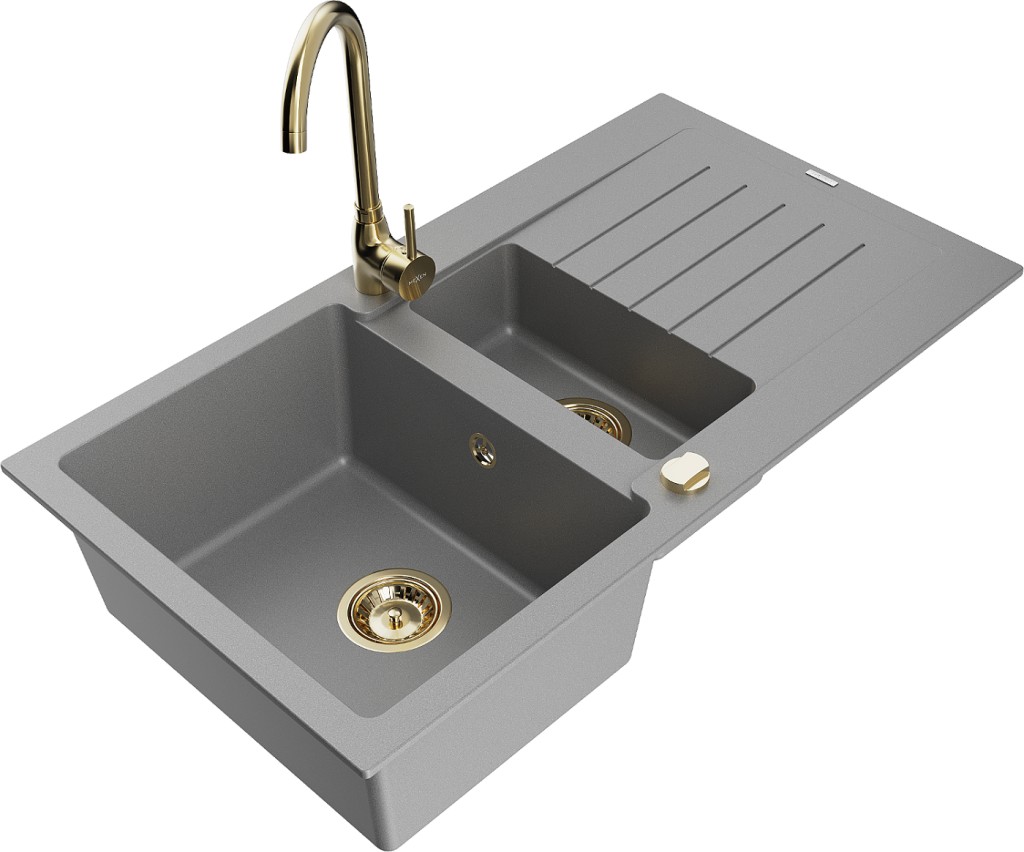 Technické dáta: drez: Rozmer: 900x505x200mm Hĺbka komory: 180 mm (väčšia), 115 mm (menšia) Rozmery komory: 435x335 mm (väčšie), 345x150 mm (menšie) Priemer odtoku: ø90 mm Typ: 1,5-komorový s krátkym odkvapkávačom Typ: Zapustené do pracovnej dosky Šedá farba Povrchová úprava sifónu: zlatá Materiál: žula (80% žulové kamenivo, 20% živice) Prepadový otvor: Áno Otvory: (batérie, automatické) 2 Inštalácia: Univerzálna, je možné inštalovať s odkvapkávačom na ľavú alebo pravú stranu Vysoká odolnosť proti poškriabaniu a zmene farby Odolnosť proti tepelným šokom Ľahko čistiteľný povrch Dva dodatočné vyfrézované otvory na samodierovanie ø35 kuchynská batéria: Materiál: mosadz Farba: Zlatá Hlava: Keramická Prevzdušňovač: Áno Typ: Jedna páka Výška batérie: 335 mm Rozsah výtoku: 180 mm(GT) Ean: 5905315013934