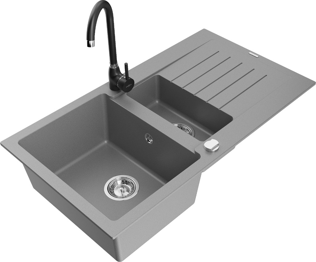 Technické dáta: drez: Rozmer: 900x505x200mm Hĺbka komory: 180 mm (väčšia), 115 mm (menšia) Rozmery komory: 435x335 mm (väčšie), 345x150 mm (menšie) Priemer odtoku: ø90 mm Typ: 1,5-komorový s krátkym odkvapkávačom Typ: Zapustené do pracovnej dosky Šedá farba Povrchová úprava sifónu: Chrome Materiál: žula (80% žulové kamenivo, 20% živice) Prepadový otvor: Áno Otvory: (batérie, automatické) 2 Inštalácia: Univerzálna, je možné inštalovať s odkvapkávačom na ľavú alebo pravú stranu Vysoká odolnosť proti poškriabaniu a zmene farby Odolnosť proti tepelným šokom Ľahko čistiteľný povrch Dva dodatočné vyfrézované otvory na samodierovanie ø35 kuchynská batéria: Materiál: mosadz Čierna farba Hlava: Keramická Prevzdušňovač: Áno Typ: Jedna páka Výška batérie: 335 mm Rozsah výtoku: 180 mm(GT) Ean: 5905315013941