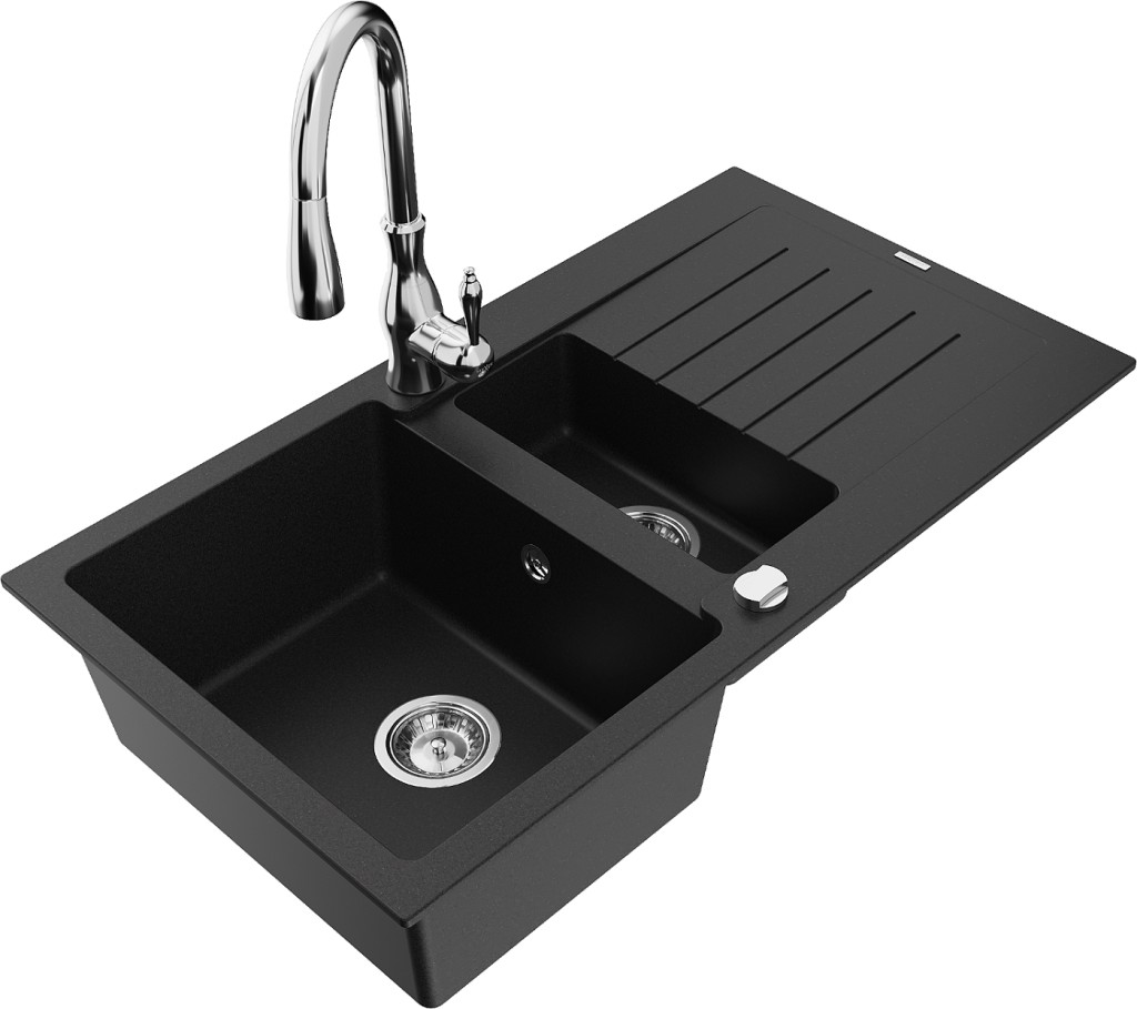Technické dáta: drez: Rozmer: 900x505x200mm Hĺbka komory: 180 mm (väčšia), 115 mm (menšia) Rozmery komory: 435x335 mm (väčšie), 345x150 mm (menšie) Priemer odtoku: ø90 mm Typ: 1,5-komorový s krátkym odkvapkávačom Typ: Zapustené do pracovnej dosky Čierna farba Povrchová úprava sifónu: Chrome Materiál: žula (80% žulové kamenivo, 20% živice) Prepadový otvor: Áno Otvory: (batérie, automatické) 2 Inštalácia: Univerzálna, je možné inštalovať s odkvapkávačom na ľavú alebo pravú stranu Vysoká odolnosť proti poškriabaniu a zmene farby Odolnosť proti tepelným šokom Ľahko čistiteľný povrch Dva dodatočné vyfrézované otvory na samodierovanie ø35 kuchynská batéria: Materiál: mosadz Farba: Chrome Hlava: Keramická Prevzdušňovač: Áno Výška batérie: 410 mm Rozsah výtoku: 231 mm(GT) Ean: 5905315032850