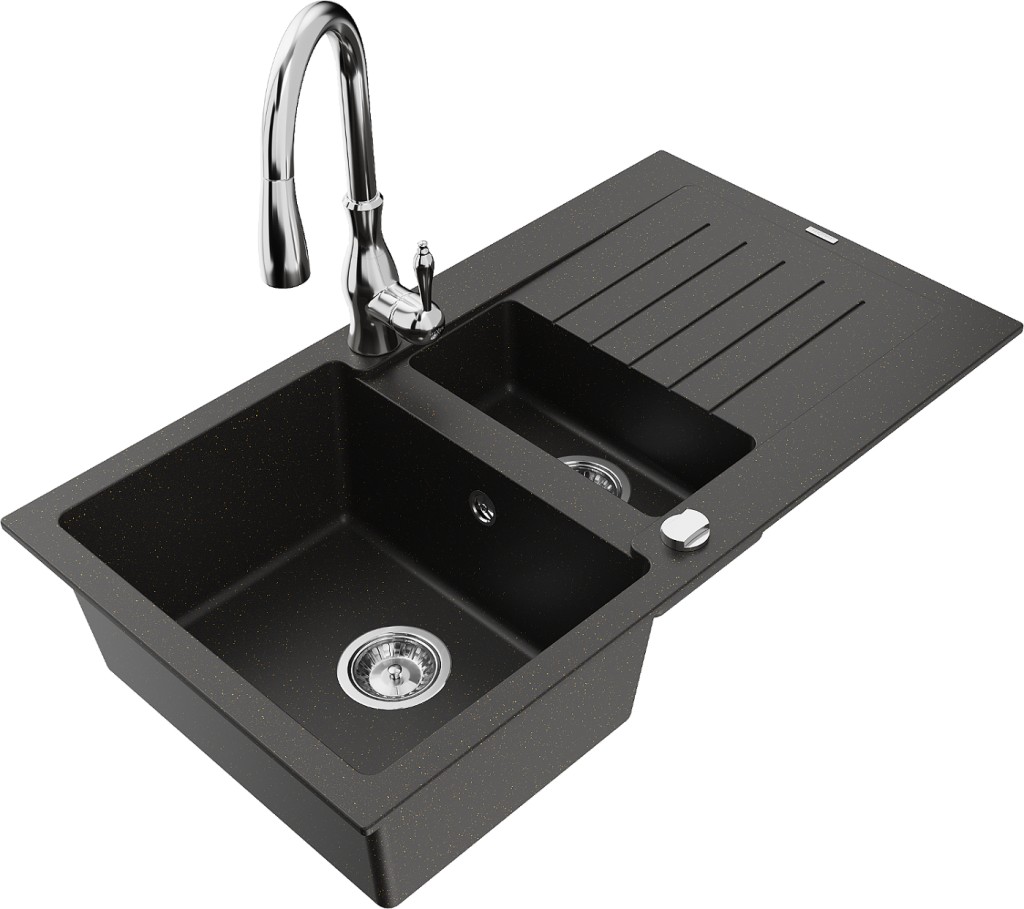 Technické dáta: drez: Rozmer: 900x505x200mm Hĺbka komory: 180 mm (väčšia), 115 mm (menšia) Rozmery komory: 435x335 mm (väčšie), 345x150 mm (menšie) Priemer odtoku: ø90 mm Typ: 1,5-komorový s krátkym odkvapkávačom Typ: Zapustené do pracovnej dosky Farba: čierna / zlatá metalíza Povrchová úprava sifónu: Chrome Materiál: žula (80% žulové kamenivo, 20% živice) Prepadový otvor: Áno Otvory: (batérie, automatické) 2 Inštalácia: Univerzálna, je možné inštalovať s odkvapkávačom na ľavú alebo pravú stranu Vysoká odolnosť proti poškriabaniu a zmene farby Odolnosť proti tepelným šokom Ľahko čistiteľný povrch Dva dodatočné vyfrézované otvory na samodierovanie ø35 kuchynská batéria: Materiál: mosadz Farba: Chrome Hlava: Keramická Prevzdušňovač: Áno Výška batérie: 410 mm Rozsah výtoku: 231 mm(GT) Ean: 5905315032768