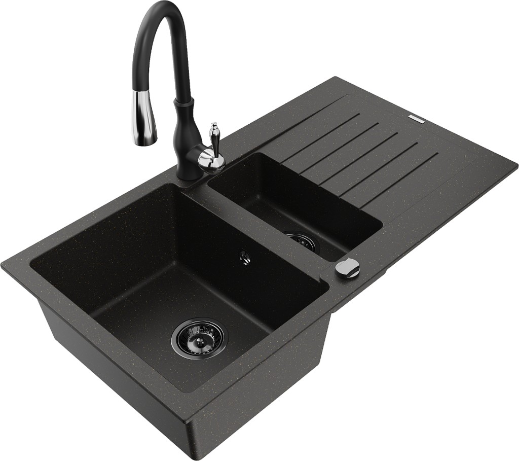 Technické dáta: drez: Rozmer: 900x505x200mm Hĺbka komory: 180 mm (väčšia), 115 mm (menšia) Rozmery komory: 435x335 mm (väčšie), 345x150 mm (menšie) Priemer odtoku: ø90 mm Typ: 1,5-komorový s krátkym odkvapkávačom Typ: Zapustené do pracovnej dosky Farba: čierna / zlatá metalíza Povrchová úprava sifónu: čierna Materiál: žula (80% žulové kamenivo, 20% živice) Prepadový otvor: Áno Otvory: (batérie, automatické) 2 Inštalácia: Univerzálna, je možné inštalovať s odkvapkávačom na ľavú alebo pravú stranu Vysoká odolnosť proti poškriabaniu a zmene farby Odolnosť proti tepelným šokom Ľahko čistiteľný povrch Dva dodatočné vyfrézované otvory na samodierovanie ø35 kuchynská batéria: Materiál: mosadz Čierna farba Hlava: Keramická Prevzdušňovač: Áno Výška batérie: 410 mm Rozsah výtoku: 231 mm(GT) Ean: 5905315032799