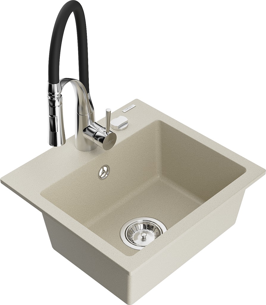 Technické dáta: drez: Rozmer: 435x410x171mm Hĺbka komory: 161 mm Rozmery komory: 375x280 mm Priemer odtoku: ø90 mm Typ: 1-komorový Typ: Zapustené do pracovnej dosky Farba béžová Povrchová úprava sifónu: Chrome Materiál: žula (80% žulové kamenivo, 20% živice) Prepadový otvor: Áno Otvory: (batérie, automatické) 2 Vysoká odolnosť proti poškriabaniu a zmene farby Odolnosť proti tepelným šokom Ľahko čistiteľný povrch Jeden dodatočný vyfrézovaný otvor na samodierovanie ø35 kuchynská batéria: Materiál: mosadz Farba: chróm/čierna Hlava: Keramická Prevzdušňovač: Áno Typ: Jedna páka Výška batérie: 430 mm Rozsah výtoku: 185 mm Batéria má výsuvný výtok(GT) Ean: 5905315044266