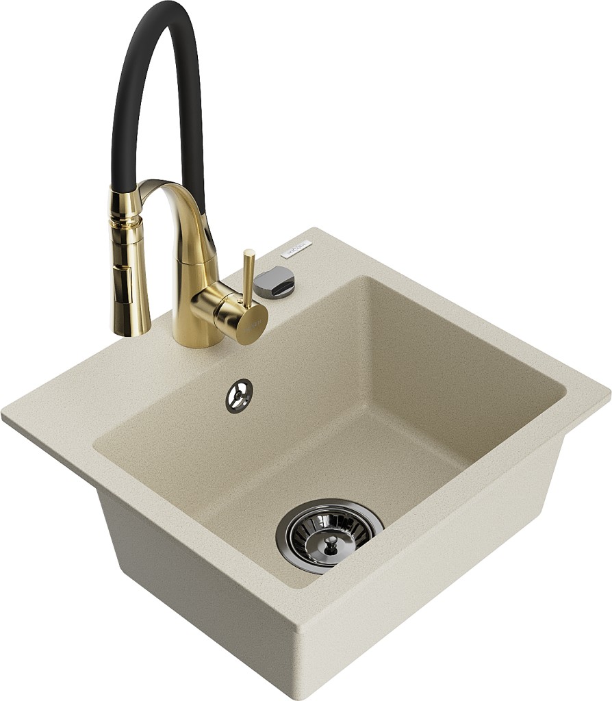 Technické dáta: drez: Rozmer: 435x410x171mm Hĺbka komory: 161 mm Rozmery komory: 375x280 mm Priemer odtoku: ø90 mm Typ: 1-komorový Typ: Zapustené do pracovnej dosky Farba béžová Povrchová úprava sifónu: čierna Materiál: žula (80% žulové kamenivo, 20% živice) Prepadový otvor: Áno Otvory: (batérie, automatické) 2 Vysoká odolnosť proti poškriabaniu a zmene farby Odolnosť proti tepelným šokom Ľahko čistiteľný povrch Jeden dodatočný vyfrézovaný otvor na samodierovanie ø35 kuchynská batéria: Materiál: mosadz Farba: Zlatá/Čierna Hlava: Keramická Prevzdušňovač: Áno Typ: Jedna páka Výška batérie: 430 mm Rozsah výtoku: 185 mm Batéria má výsuvný výtok(GT) Ean: 5905315044297