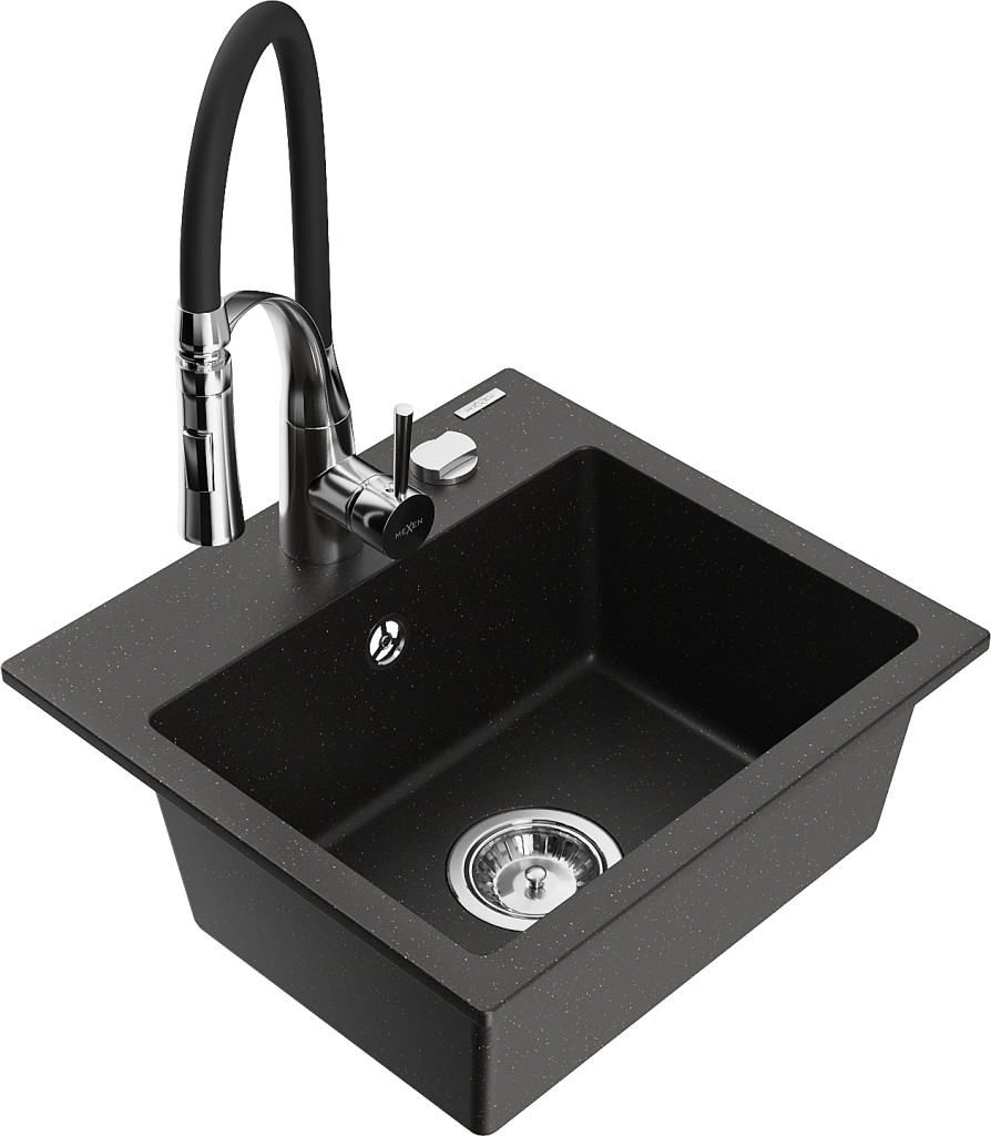 Technické dáta: drez: Rozmer: 435x410x171mm Hĺbka komory: 161 mm Rozmery komory: 375x280 mm Priemer odtoku: ø90 mm Typ: 1-komorový Typ: Zapustené do pracovnej dosky Farba: čierna / zlatá metalíza Povrchová úprava sifónu: Chrome Materiál: žula (80% žulové kamenivo, 20% živice) Prepadový otvor: Áno Otvory: (batérie, automatické) 2 Vysoká odolnosť proti poškriabaniu a zmene farby Odolnosť proti tepelným šokom Ľahko čistiteľný povrch Jeden dodatočný vyfrézovaný otvor na samodierovanie ø35 kuchynská batéria: Materiál: mosadz Farba: chróm/čierna Hlava: Keramická Prevzdušňovač: Áno Typ: Jedna páka Výška batérie: 430 mm Rozsah výtoku: 185 mm Batéria má výsuvný výtok(GT) Ean: 5905315044440