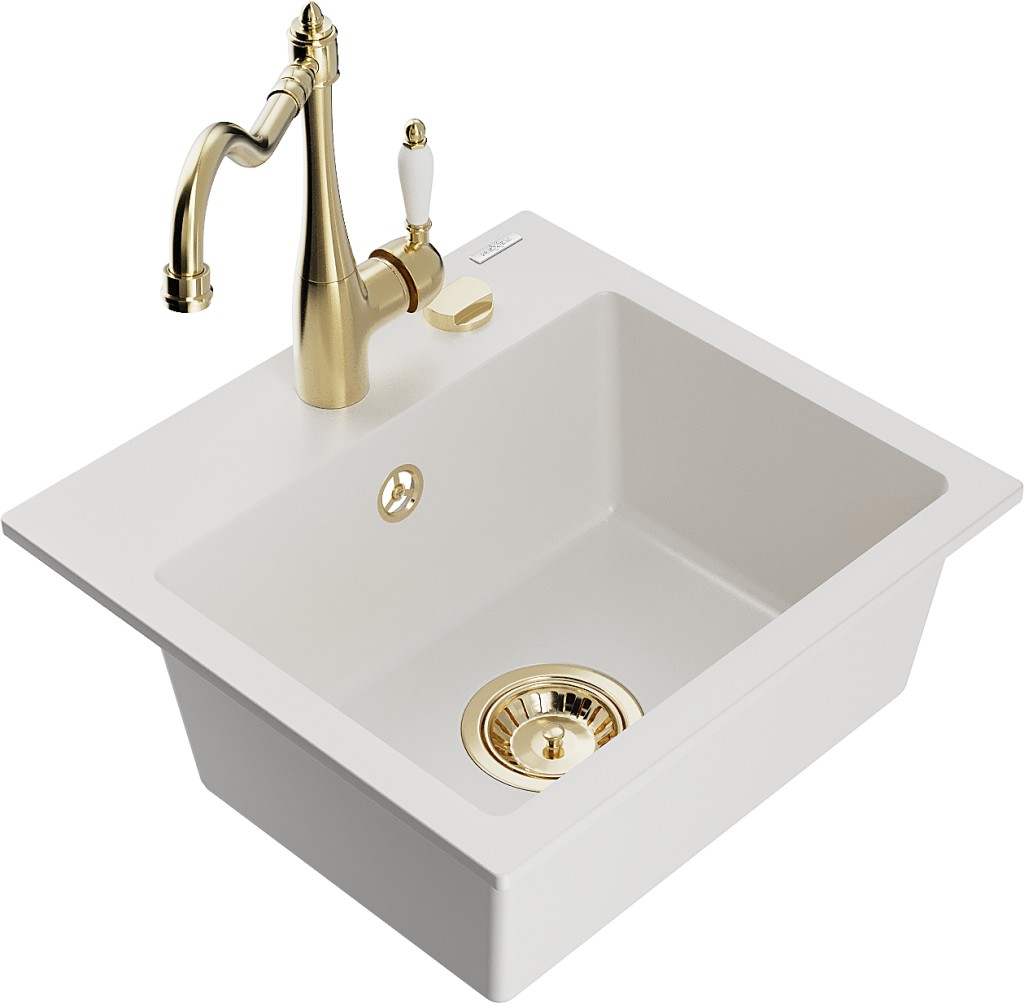 Technické dáta: drez: Rozmer: 435x410x171mm Hĺbka komory: 161 mm Rozmery komory: 375x280 mm Priemer odtoku: ø90 mm Typ: 1-komorový Typ: Zapustené do pracovnej dosky biela farba Povrchová úprava sifónu: zlatá Materiál: žula (80% žulové kamenivo, 20% živice) Prepadový otvor: Áno Otvory: (batérie, automatické) 2 Vysoká odolnosť proti poškriabaniu a zmene farby Odolnosť proti tepelným šokom Ľahko čistiteľný povrch Jeden dodatočný vyfrézovaný otvor na samodierovanie ø35 kuchynská batéria: Materiál: mosadz Farba: Zlatá Hlava: Keramická Prevzdušňovač: Áno Typ: Jedna páka Výška batérie: 290 mm Rozsah výtoku: 260 mm(GT) Ean: 5905315038685