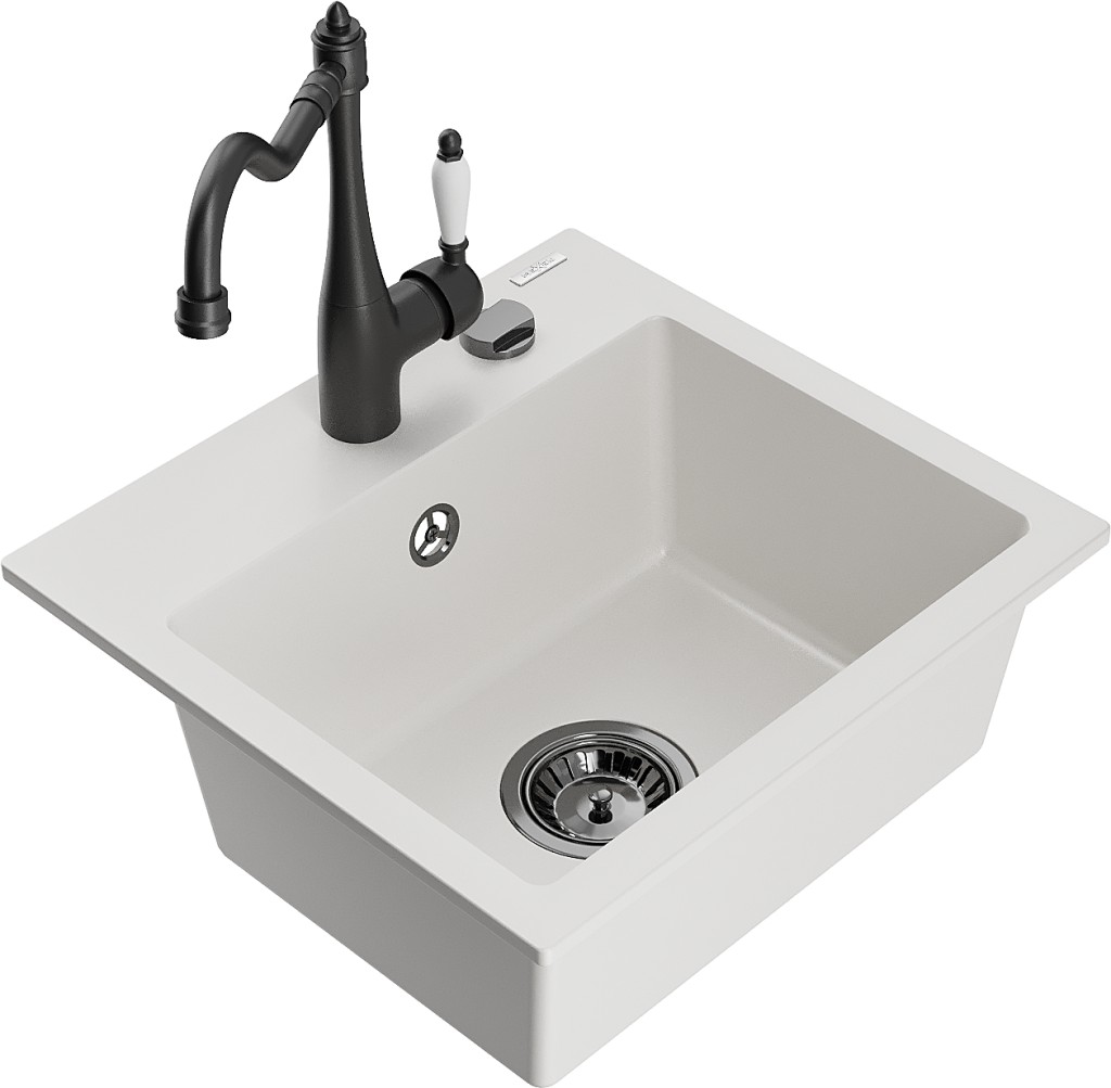 Technické dáta: drez: Rozmer: 435x410x171mm Hĺbka komory: 161 mm Rozmery komory: 375x280 mm Priemer odtoku: ø90 mm Typ: 1-komorový Typ: Zapustené do pracovnej dosky biela farba Povrchová úprava sifónu: čierna Materiál: žula (80% žulové kamenivo, 20% živice) Prepadový otvor: Áno Otvory: (batérie, automatické) 2 Vysoká odolnosť proti poškriabaniu a zmene farby Odolnosť proti tepelným šokom Ľahko čistiteľný povrch Jeden dodatočný vyfrézovaný otvor na samodierovanie ø35 kuchynská batéria: Materiál: mosadz Čierna farba Hlava: Keramická Prevzdušňovač: Áno Typ: Jedna páka Výška batérie: 290 mm Rozsah výtoku: 260 mm(GT) Ean: 5905315038692