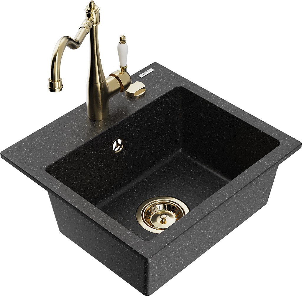 Technické dáta: drez: Rozmer: 435x410x171mm Hĺbka komory: 161 mm Rozmery komory: 375x280 mm Priemer odtoku: ø90 mm Typ: 1-komorový Typ: Zapustené do pracovnej dosky Farba: čierna/strieborná metalíza Povrchová úprava sifónu: zlatá Materiál: žula (80% žulové kamenivo, 20% živice) Prepadový otvor: Áno Otvory: (batérie, automatické) 2 Vysoká odolnosť proti poškriabaniu a zmene farby Odolnosť proti tepelným šokom Ľahko čistiteľný povrch Jeden dodatočný vyfrézovaný otvor na samodierovanie ø35 kuchynská batéria: Materiál: mosadz Farba: Zlatá Hlava: Keramická Prevzdušňovač: Áno Typ: Jedna páka Výška batérie: 290 mm Rozsah výtoku: 260 mm(GT) Ean: 5905315038807