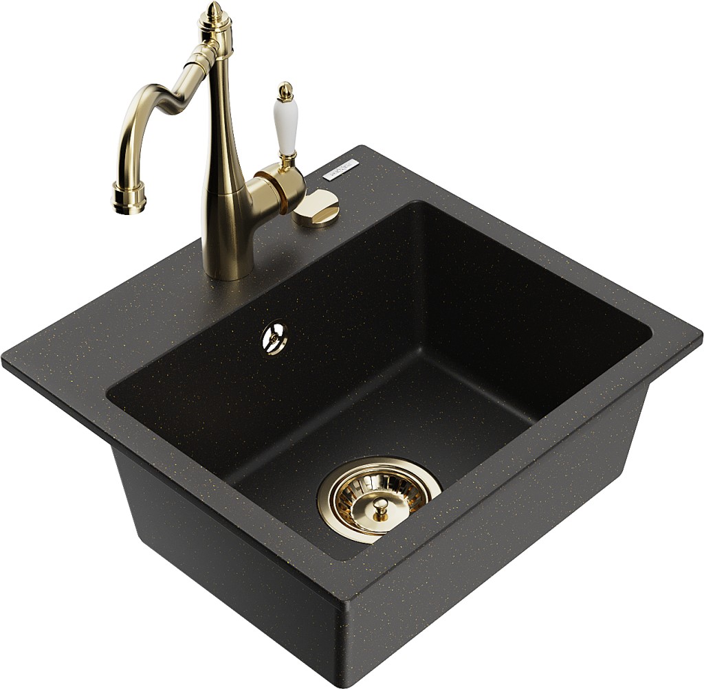 Technické dáta: drez: Rozmer: 435x410x171mm Hĺbka komory: 161 mm Rozmery komory: 375x280 mm Priemer odtoku: ø90 mm Typ: 1-komorový Typ: Zapustené do pracovnej dosky Farba: čierna / zlatá metalíza Povrchová úprava sifónu: zlatá Materiál: žula (80% žulové kamenivo, 20% živice) Prepadový otvor: Áno Otvory: (batérie, automatické) 2 Vysoká odolnosť proti poškriabaniu a zmene farby Odolnosť proti tepelným šokom Ľahko čistiteľný povrch Jeden dodatočný vyfrézovaný otvor na samodierovanie ø35 kuchynská batéria: Materiál: mosadz Farba: Zlatá Hlava: Keramická Prevzdušňovač: Áno Typ: Jedna páka Výška batérie: 290 mm Rozsah výtoku: 260 mm(GT) Ean: 5905315038845