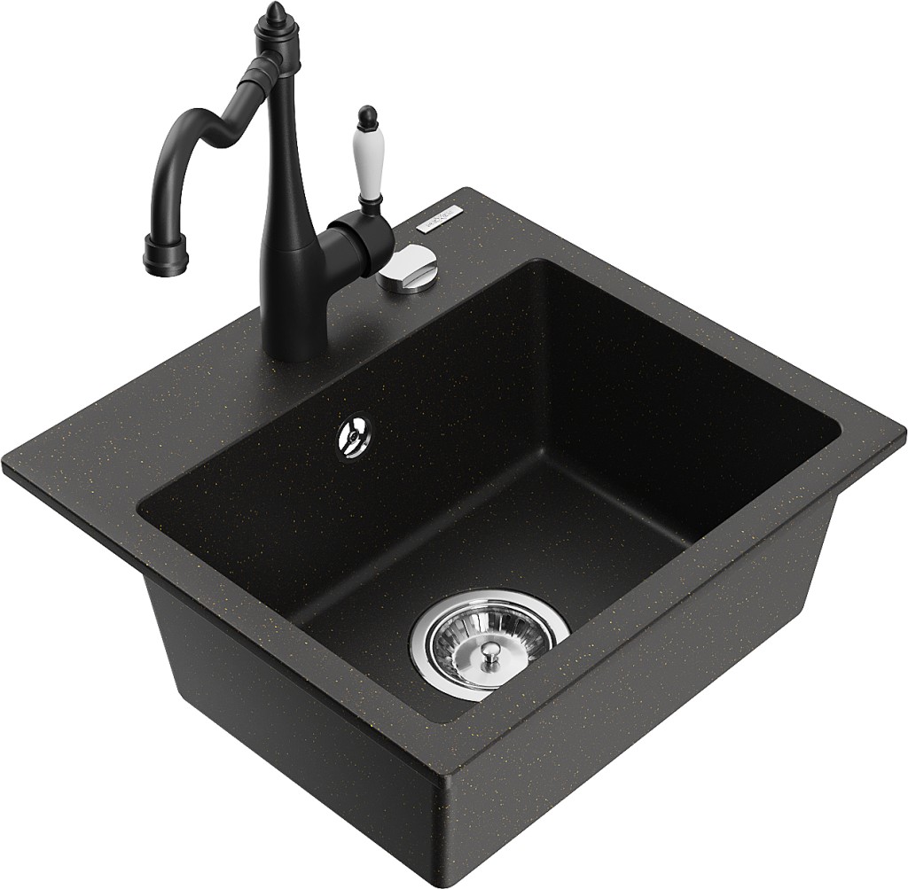 Technické dáta: drez: Rozmer: 435x410x171mm Hĺbka komory: 161 mm Rozmery komory: 375x280 mm Priemer odtoku: ø90 mm Typ: 1-komorový Typ: Zapustené do pracovnej dosky Farba: čierna / zlatá metalíza Povrchová úprava sifónu: Chrome Materiál: žula (80% žulové kamenivo, 20% živice) Prepadový otvor: Áno Otvory: (batérie, automatické) 2 Vysoká odolnosť proti poškriabaniu a zmene farby Odolnosť proti tepelným šokom Ľahko čistiteľný povrch Jeden dodatočný vyfrézovaný otvor na samodierovanie ø35 kuchynská batéria: Materiál: mosadz Čierna farba Hlava: Keramická Prevzdušňovač: Áno Typ: Jedna páka Výška batérie: 290 mm Rozsah výtoku: 260 mm(GT) Ean: 5905315038876