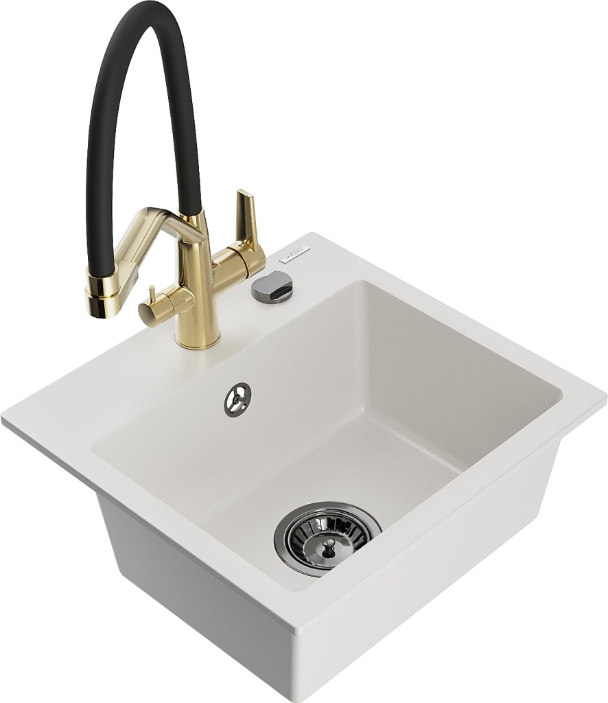 Technické dáta: drez: Rozmer: 435x410x171mm Hĺbka komory: 161 mm Rozmery komory: 375x280 mm Priemer odtoku: ø90 mm Typ: 1-komorový Typ: Zapustené do pracovnej dosky biela farba Povrchová úprava sifónu: čierna Materiál: žula (80% žulové kamenivo, 20% živice) Prepadový otvor: Áno Otvory: (batérie, automatické) 2 Vysoká odolnosť proti poškriabaniu a zmene farby Odolnosť proti tepelným šokom Ľahko čistiteľný povrch Jeden dodatočný vyfrézovaný otvor na samodierovanie ø35 kuchynská batéria: Materiál: mosadz Farba: Zlatá/Čierna Hlavy: Keramické Prevzdušňovač: Áno Typ hubica: Flexibilný s mosadzným držiakom Rozsah výtoku: 260 mm Výška: 405 mm Typ: Dve rukoväte Dvojhlavá batéria s prídavným filtrom na pitnú vodu(GT) Ean: 5905315048332