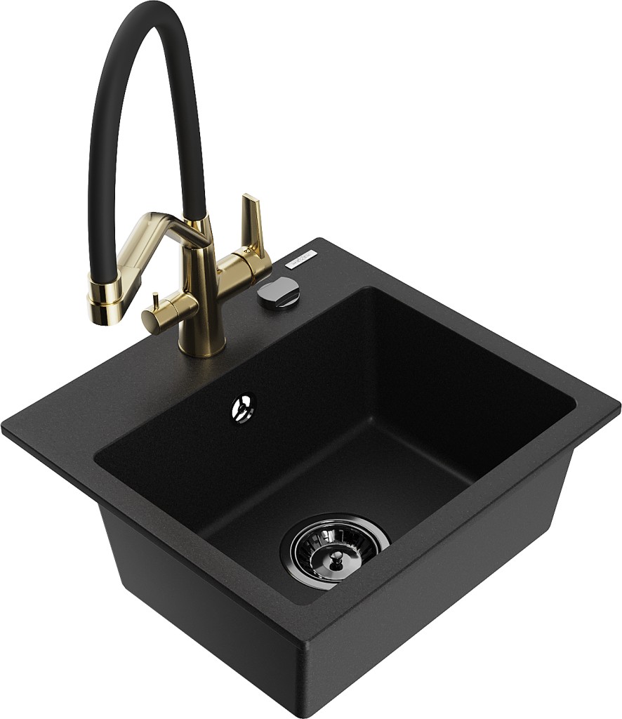 Technické dáta: drez: Rozmer: 435x410x171mm Hĺbka komory: 161 mm Rozmery komory: 375x280 mm Priemer odtoku: ø90 mm Typ: 1-komorový Typ: Zapustené do pracovnej dosky Čierna farba Povrchová úprava sifónu: čierna Materiál: žula (80% žulové kamenivo, 20% živice) Prepadový otvor: Áno Otvory: (batérie, automatické) 2 Vysoká odolnosť proti poškriabaniu a zmene farby Odolnosť proti tepelným šokom Ľahko čistiteľný povrch Jeden dodatočný vyfrézovaný otvor na samodierovanie ø35 kuchynská batéria: Materiál: mosadz Farba: Zlatá/Čierna Hlavy: Keramické Prevzdušňovač: Áno Typ hubica: Flexibilný s mosadzným držiakom Rozsah výtoku: 260 mm Výška: 405 mm Typ: Dve rukoväte Dvojhlavá batéria s prídavným filtrom na pitnú vodu(GT) Ean: 5905315100061