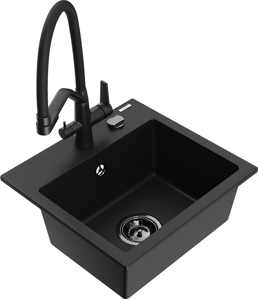 Technické dáta: drez: Rozmer: 435x410x171mm Hĺbka komory: 161 mm Rozmery komory: 375x280 mm Priemer odtoku: ø90 mm Typ: 1-komorový Typ: Zapustené do pracovnej dosky Čierna farba Povrchová úprava sifónu: čierna Materiál: žula (80% žulové kamenivo, 20% živice) Prepadový otvor: Áno Otvory: (batérie, automatické) 2 Vysoká odolnosť proti poškriabaniu a zmene farby Odolnosť proti tepelným šokom Ľahko čistiteľný povrch Jeden dodatočný vyfrézovaný otvor na samodierovanie ø35 kuchynská batéria: Materiál: mosadz Čierna farba Hlavy: Keramické Prevzdušňovač: Áno Typ hubica: Flexibilný s mosadzným držiakom Rozsah výtoku: 260 mm Výška: 405 mm Typ: Dve rukoväte Dvojhlavá batéria s prídavným filtrom na pitnú vodu (GT) Ean: 5905315100078
