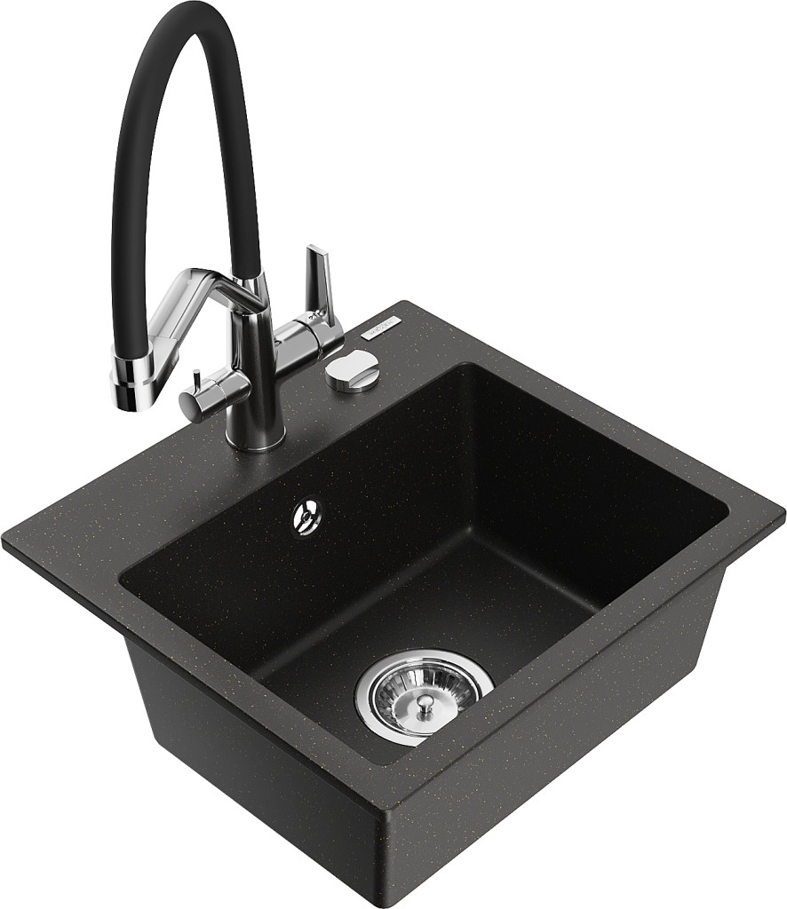 Technické dáta: drez: Rozmer: 435x410x171mm Hĺbka komory: 161 mm Rozmery komory: 375x280 mm Priemer odtoku: ø90 mm Typ: 1-komorový Typ: Zapustené do pracovnej dosky Farba: čierna / zlatá metalíza Povrchová úprava sifónu: Chrome Materiál: žula (80% žulové kamenivo, 20% živice) Prepadový otvor: Áno Otvory: (batérie, automatické) 2 Vysoká odolnosť proti poškriabaniu a zmene farby Odolnosť proti tepelným šokom Ľahko čistiteľný povrch Jeden dodatočný vyfrézovaný otvor na samodierovanie ø35 kuchynská batéria: Materiál: mosadz Farba: chróm/čierna Hlavy: Keramické Prevzdušňovač: Áno Typ hubica: Flexibilný s mosadzným držiakom Rozsah výtoku: 260 mm Výška: 405 mm Typ: Dve rukoväte Dvojhlavá batéria s prídavným filtrom na pitnú vodu(GT) Ean: 5905315049537