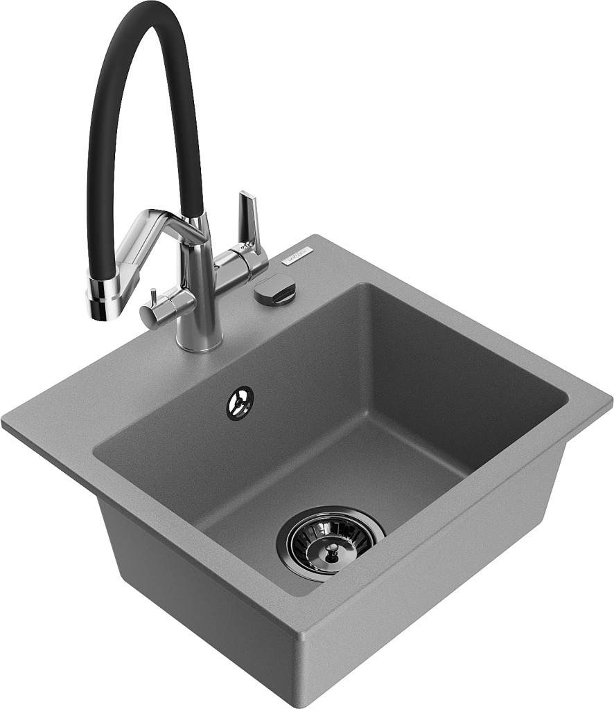 Technické dáta: drez: Rozmer: 435x410x171mm Hĺbka komory: 161 mm Rozmery komory: 375x280 mm Priemer odtoku: ø90 mm Typ: 1-komorový Typ: Zapustené do pracovnej dosky Šedá farba Povrchová úprava sifónu: čierna Materiál: žula (80% žulové kamenivo, 20% živice) Prepadový otvor: Áno Otvory: (batérie, automatické) 2 Vysoká odolnosť proti poškriabaniu a zmene farby Odolnosť proti tepelným šokom Ľahko čistiteľný povrch Jeden dodatočný vyfrézovaný otvor na samodierovanie ø35 kuchynská batéria: Materiál: mosadz Farba: chróm/čierna Hlavy: Keramické Prevzdušňovač: Áno Typ hubica: Flexibilný s mosadzným držiakom Rozsah výtoku: 260 mm Výška: 405 mm Typ: Dve rukoväte Dvojhlavá batéria s prídavným filtrom na pitnú vodu(GT) Ean: 5905315048936