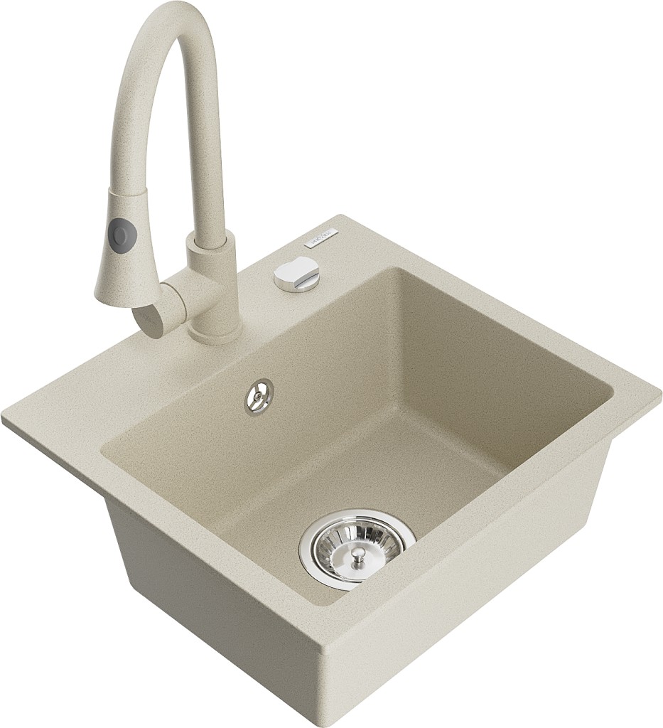 Technické dáta: drez: Rozmer: 435x410x171mm Hĺbka komory: 161 mm Rozmery komory: 375x280 mm Priemer odtoku: ø90 mm Typ: 1-komorový Typ: Zapustené do pracovnej dosky Farba béžová Povrchová úprava sifónu: Chrome Materiál: žula (80% žulové kamenivo, 20% živice) Prepadový otvor: Áno Otvory: (batérie, automatické) 2 Vysoká odolnosť proti poškriabaniu a zmene farby Odolnosť proti tepelným šokom Ľahko čistiteľný povrch Jeden dodatočný vyfrézovaný otvor na samodierovanie ø35 kuchynská batéria: Materiál: mosadz Farba béžová Hlava: Keramická Prevzdušňovač: Áno Typ: Jedna páka Výška batérie: 380 mm Rozsah výtoku: 252 mm Typ výtoku: Výsuvný(GT) Ean: 5905315028457