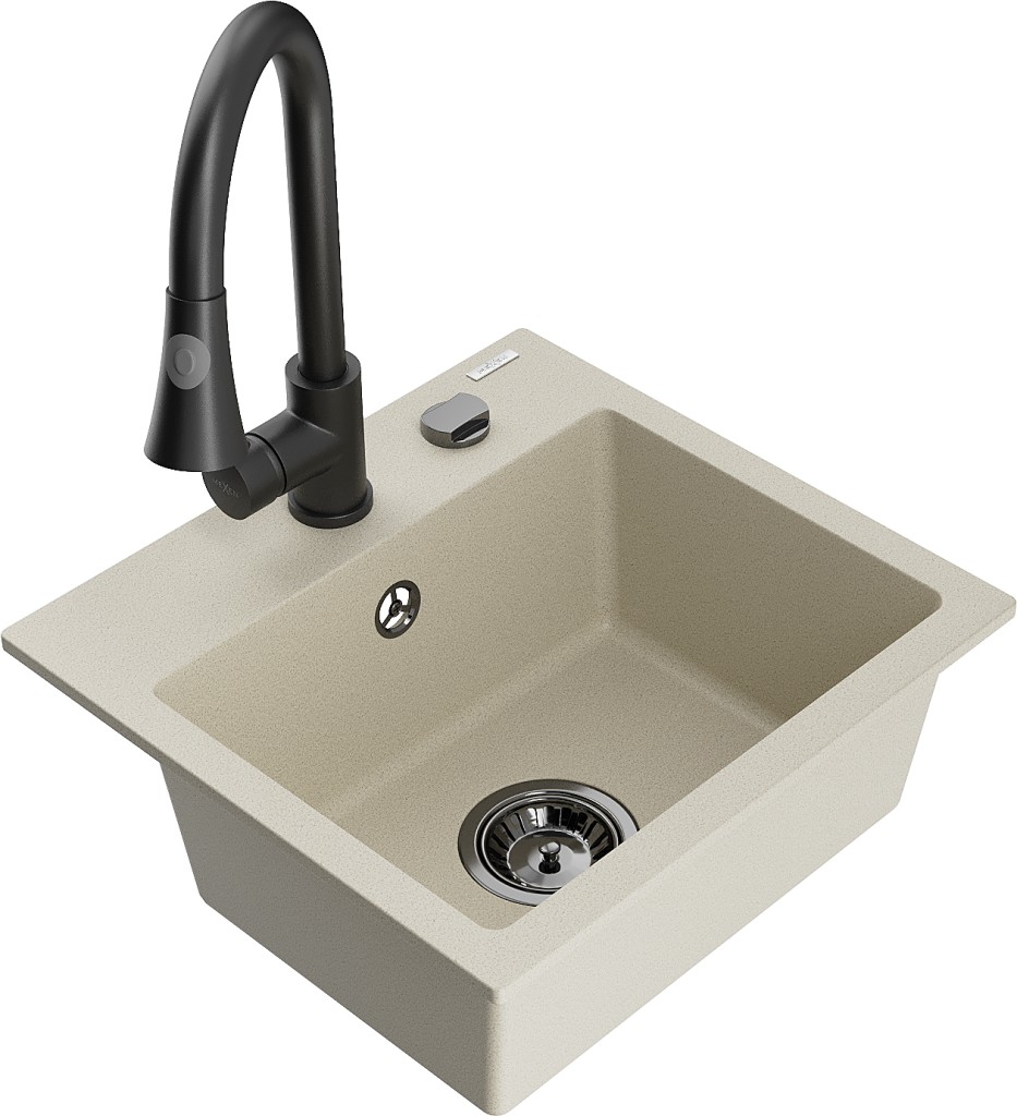 Technické dáta: drez: Rozmer: 435x410x171mm Hĺbka komory: 161 mm Rozmery komory: 375x280 mm Priemer odtoku: ø90 mm Typ: 1-komorový Typ: Zapustené do pracovnej dosky Farba béžová Povrchová úprava sifónu: čierna Materiál: žula (80% žulové kamenivo, 20% živice) Prepadový otvor: Áno Otvory: (batérie, automatické) 2 Vysoká odolnosť proti poškriabaniu a zmene farby Odolnosť proti tepelným šokom Ľahko čistiteľný povrch Jeden dodatočný vyfrézovaný otvor na samodierovanie ø35 kuchynská batéria: Materiál: mosadz Čierna farba Hlava: Keramická Prevzdušňovač: Áno Typ: Jedna páka Výška batérie: 380 mm Rozsah výtoku: 252 mm Typ výtoku: Výsuvný(GT) Ean: 5905315028471