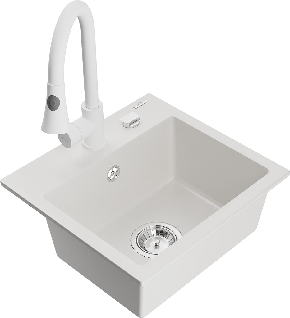Technické dáta: drez: Rozmer: 435x410x171mm Hĺbka komory: 161 mm Rozmery komory: 375x280 mm Priemer odtoku: ø90 mm Typ: 1-komorový Typ: Zapustené do pracovnej dosky biela farba Povrchová úprava sifónu: Chrome Materiál: žula (80% žulové kamenivo, 20% živice) Prepadový otvor: Áno Otvory: (batérie, automatické) 2 Vysoká odolnosť proti poškriabaniu a zmene farby Odolnosť proti tepelným šokom Ľahko čistiteľný povrch Jeden dodatočný vyfrézovaný otvor na samodierovanie ø35 kuchynská batéria: Materiál: mosadz biela farba Hlava: Keramická Prevzdušňovač: Áno Typ: Jedna páka Výška batérie: 380 mm Rozsah výtoku: 252 mm Typ výtoku: Výsuvný(GT) Ean: 5905315028419