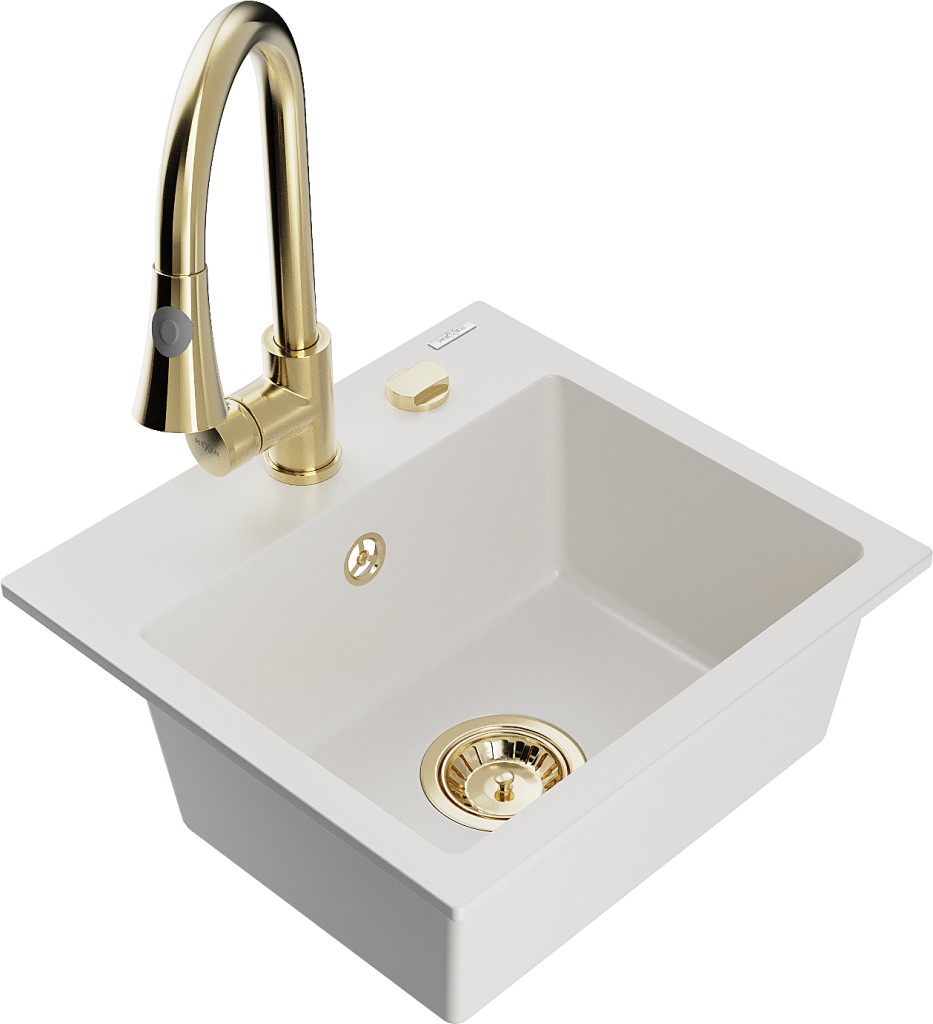 Technické dáta: drez: Rozmer: 435x410x171mm Hĺbka komory: 161 mm Rozmery komory: 375x280 mm Priemer odtoku: ø90 mm Typ: 1-komorový Typ: Zapustené do pracovnej dosky biela farba Povrchová úprava sifónu: zlatá Materiál: žula (80% žulové kamenivo, 20% živice) Prepadový otvor: Áno Otvory: (batérie, automatické) 2 Vysoká odolnosť proti poškriabaniu a zmene farby Odolnosť proti tepelným šokom Ľahko čistiteľný povrch Jeden dodatočný vyfrézovaný otvor na samodierovanie ø35 kuchynská batéria: Materiál: mosadz Farba: Zlatá Hlava: Keramická Prevzdušňovač: Áno Typ: Jedna páka Výška batérie: 380 mm Rozsah výtoku: 252 mm Typ výtoku: Výsuvný(GT) Ean: 5905315028426