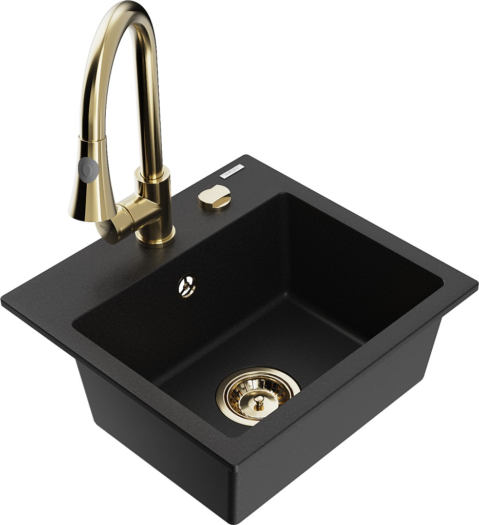 Technické dáta: drez: Rozmer: 435x410x171mm Hĺbka komory: 161 mm Rozmery komory: 375x280 mm Priemer odtoku: ø90 mm Typ: 1-komorový Typ: Zapustené do pracovnej dosky Čierna farba Povrchová úprava sifónu: zlatá Materiál: žula (80% žulové kamenivo, 20% živice) Prepadový otvor: Áno Otvory: (batérie, automatické) 2 Vysoká odolnosť proti poškriabaniu a zmene farby Odolnosť proti tepelným šokom Ľahko čistiteľný povrch Jeden dodatočný vyfrézovaný otvor na samodierovanie ø35 kuchynská batéria: Materiál: mosadz Farba: Zlatá Hlava: Keramická Prevzdušňovač: Áno Typ: Jedna páka Výška batérie: 380 mm Rozsah výtoku: 252 mm Typ výtoku: Výsuvný(GT) Ean: 5905315028693