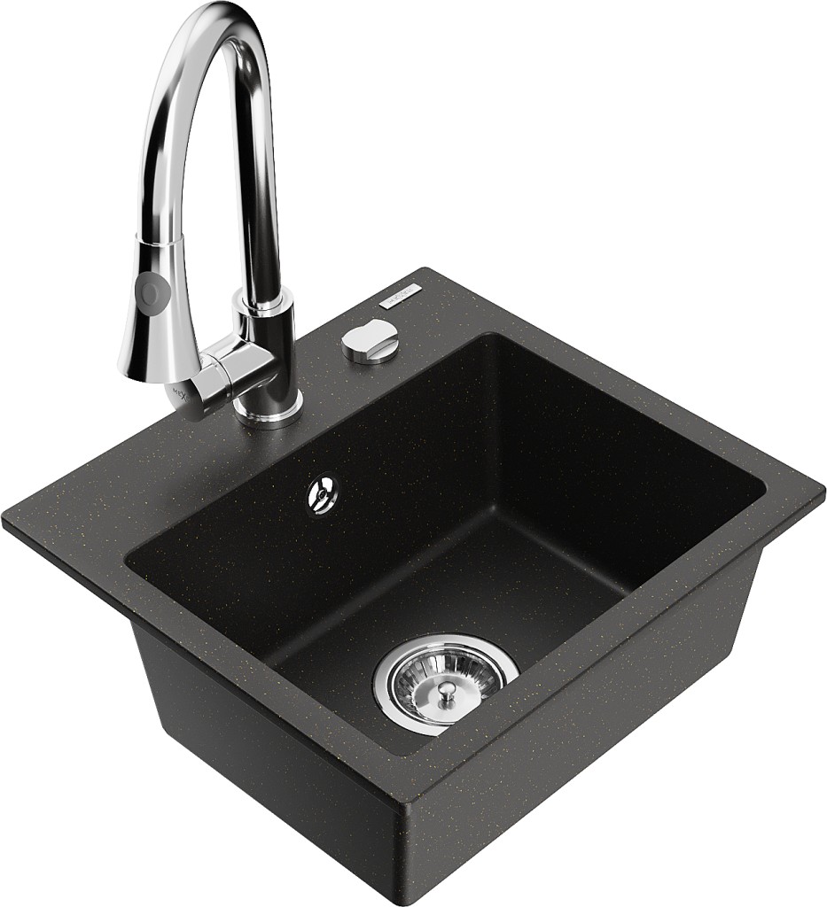 Technické dáta: drez: Rozmer: 435x410x171mm Hĺbka komory: 161 mm Rozmery komory: 375x280 mm Priemer odtoku: ø90 mm Typ: 1-komorový Typ: Zapustené do pracovnej dosky Farba: čierna / zlatá metalíza Povrchová úprava sifónu: Chrome Materiál: žula (80% žulové kamenivo, 20% živice) Prepadový otvor: Áno Otvory: (batérie, automatické) 2 Vysoká odolnosť proti poškriabaniu a zmene farby Odolnosť proti tepelným šokom Ľahko čistiteľný povrch Jeden dodatočný vyfrézovaný otvor na samodierovanie ø35 kuchynská batéria: Materiál: mosadz Farba: Chrome Hlava: Keramická Prevzdušňovač: Áno Typ: Jedna páka Výška batérie: 380 mm Rozsah výtoku: 252 mm Typ výtoku: Výsuvný(GT) Ean: 5905315028570